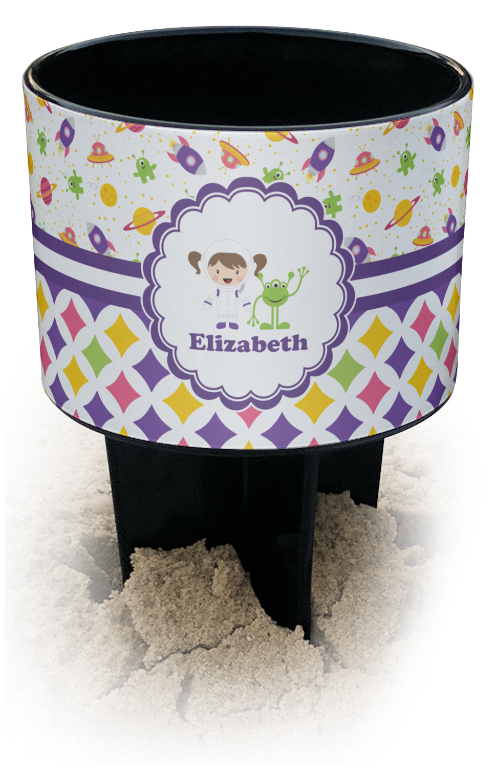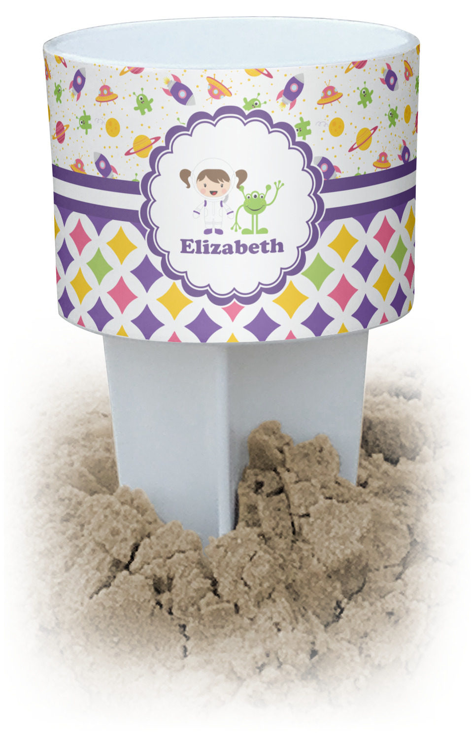 This cup holder has a large stake at its bottom that anchors it to the sand or ground below, while the cup holder rests above the stake. The entire drink holder is made of durable plastic and displays your customization around the cup holder portion. We sell these personalized beach spikers in two different colors: black and white.