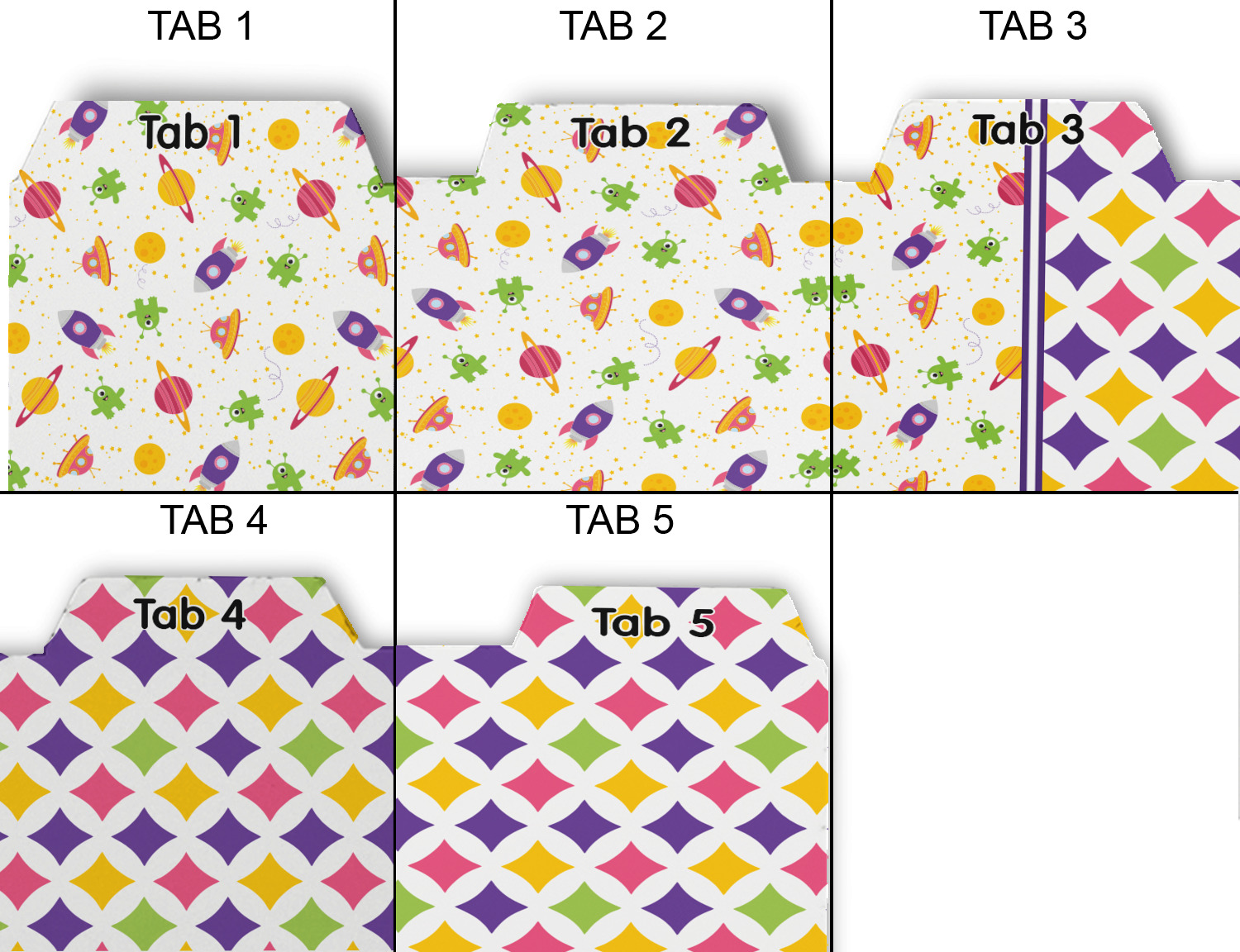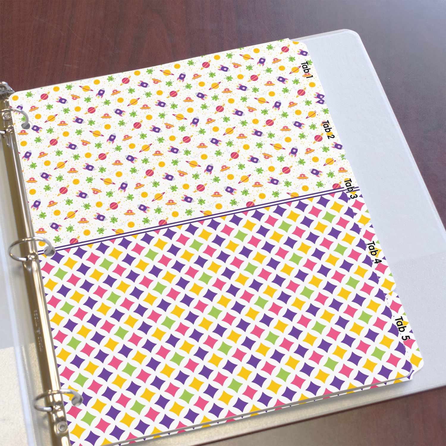 Whether you use binders at school or at work, we have designs to suit all of them. Available in 5 or 6 tab sets, you are sure to find a set to suit your needs. The back of each one is white and can be used to take notes, write vital information on, etc.