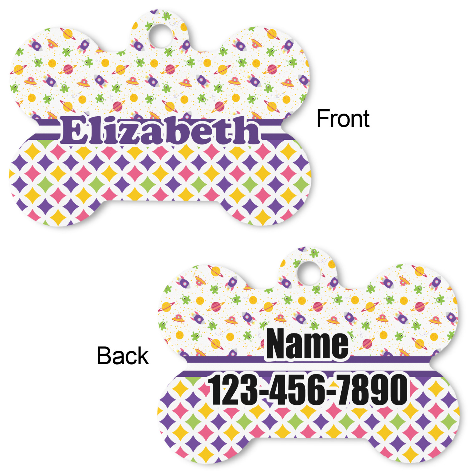 Our default design templates print your dog's personalization on the front and your contact information on the back; however everything is customizable, so you customize the patterns, the colors, the personalization, the contact information etc.