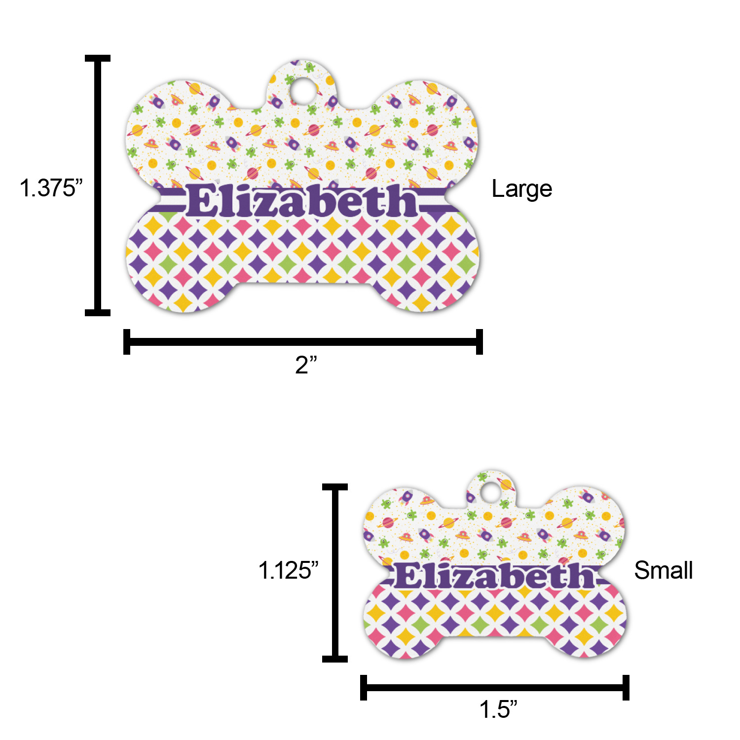 The small bone dog tag size is perfect to pair with our small dog collars, the large size pairs well with our large dog collars.