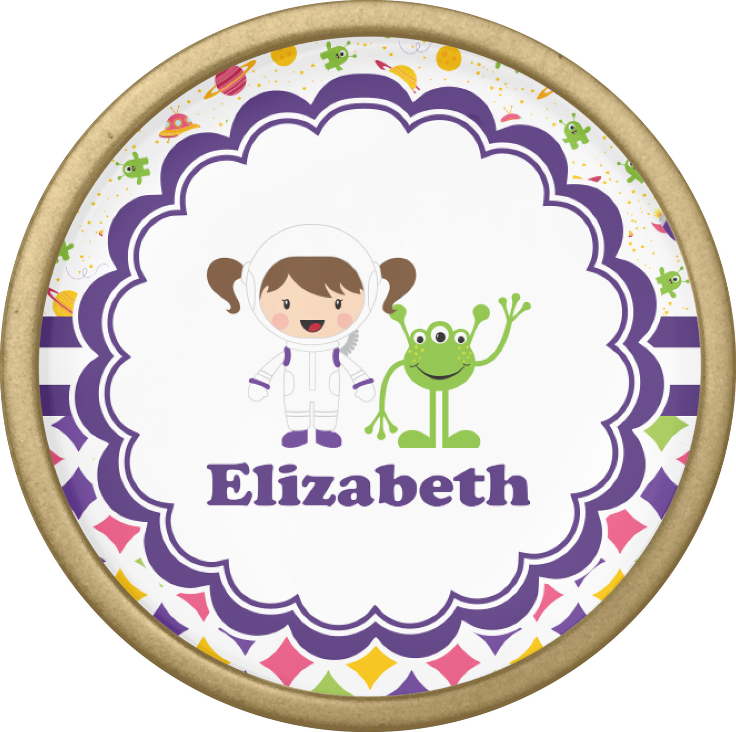 A wide white band trimmed in purple highlights the scallop label showcasing the little girl and her favorite martian personalized with your little one's name.