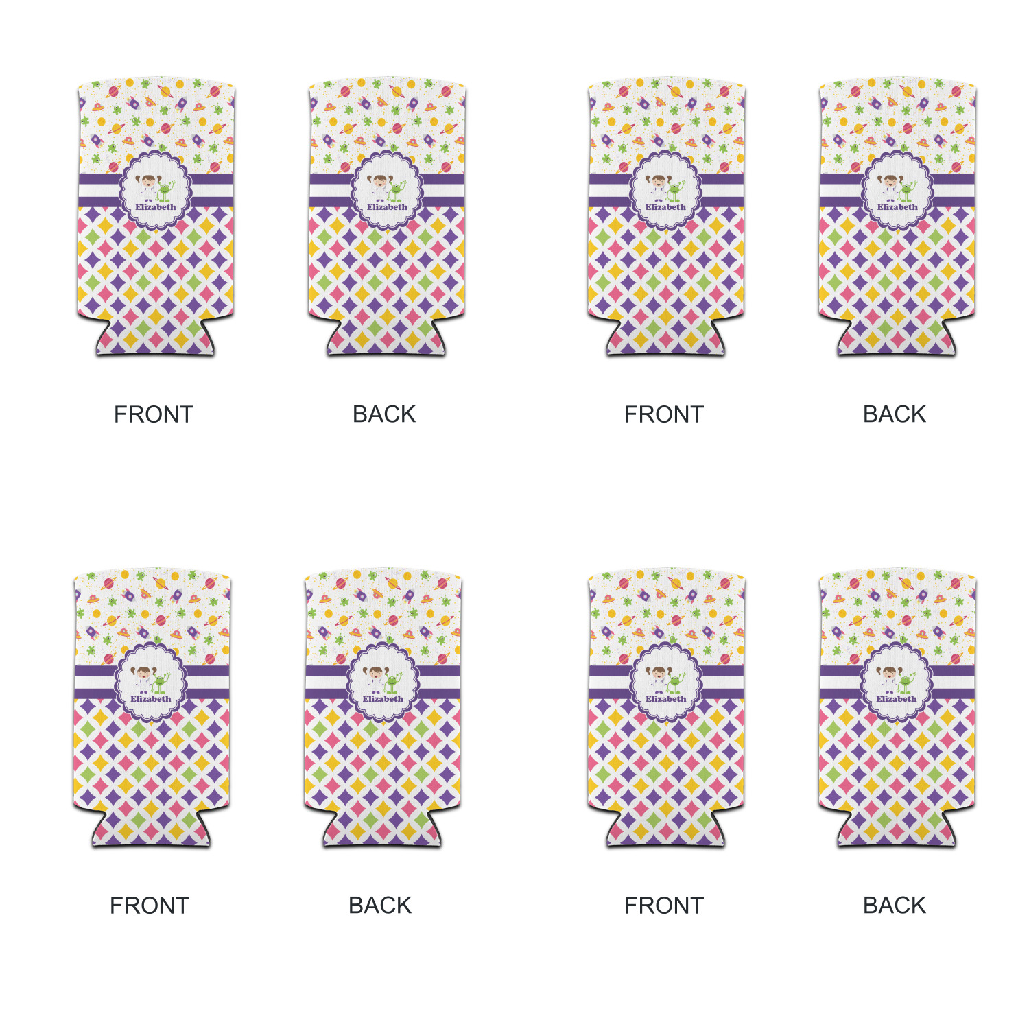 Girls love space exploration too. We have used our popular space design full of little green martians, purple and pink spaceships, yellow and pink planets, and yellow stars galore and paired it with a whimsical diamond pattern using coordinating colors.