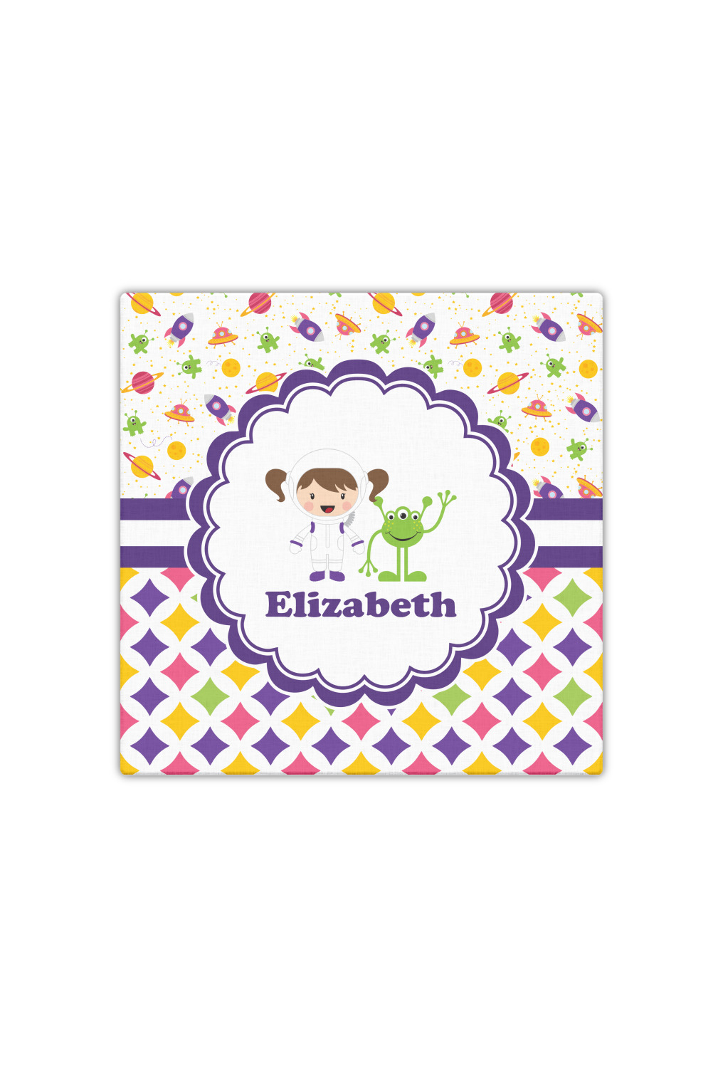 A wide white band trimmed in purple highlights the scallop label showcasing the little girl and her favorite martian personalized with your little one's name.