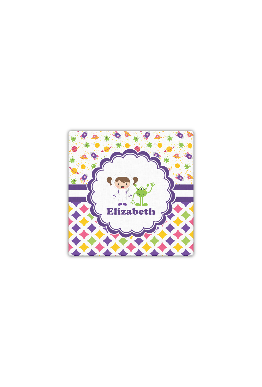 A wide white band trimmed in purple highlights the scallop label showcasing the little girl and her favorite martian personalized with your little one's name.