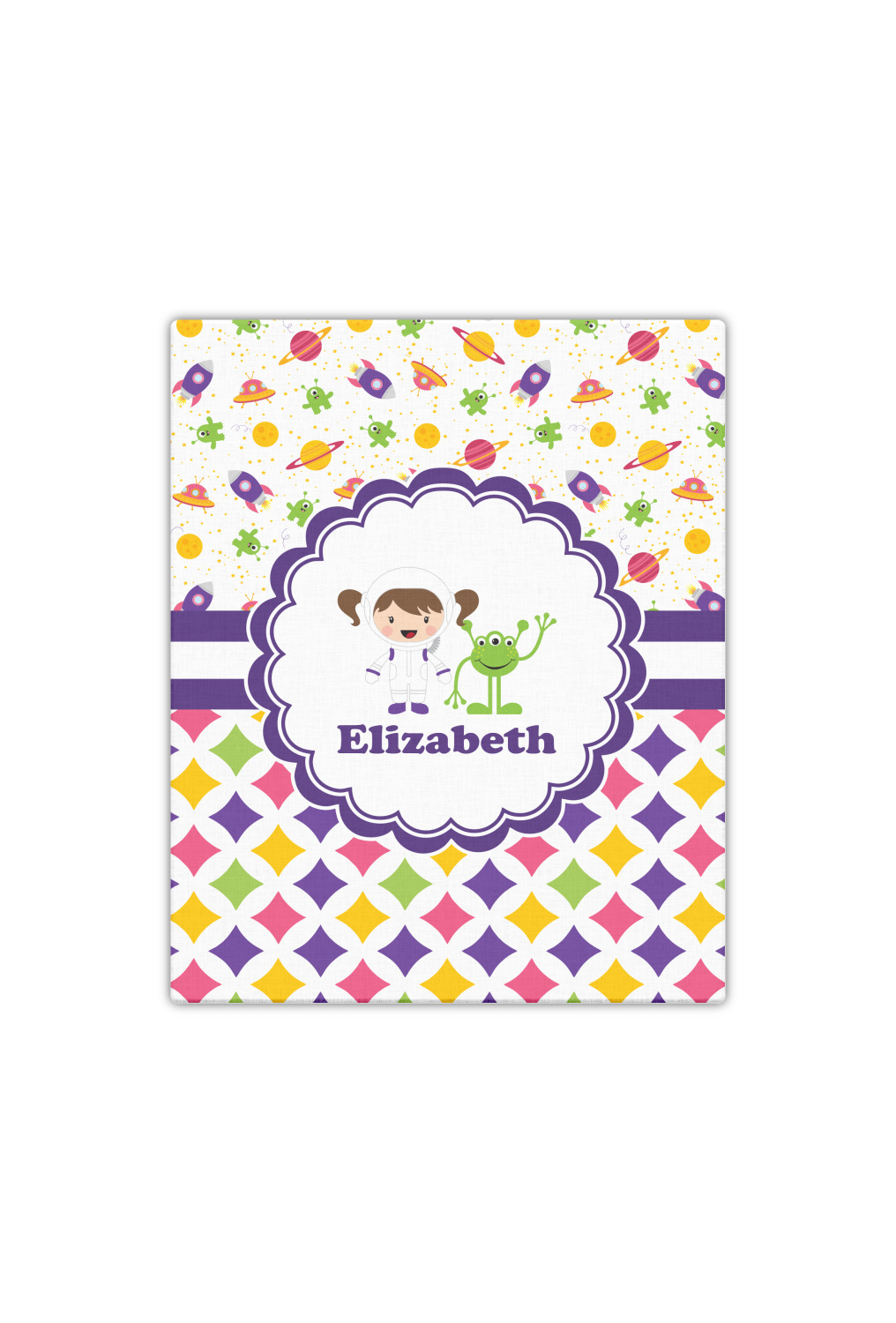 A wide white band trimmed in purple highlights the scallop label showcasing the little girl and her favorite martian personalized with your little one's name.
