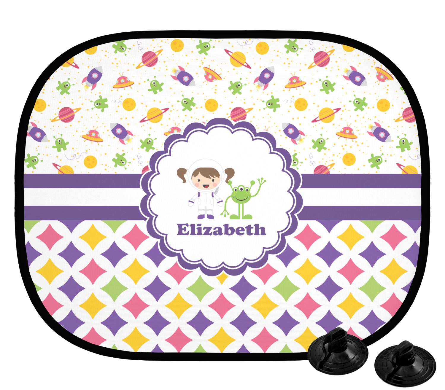 Girls love space exploration too. We have used our popular space design full of little green martians, purple and pink spaceships, yellow and pink planets, and yellow stars galore and paired it with a whimsical diamond pattern using coordinating colors.