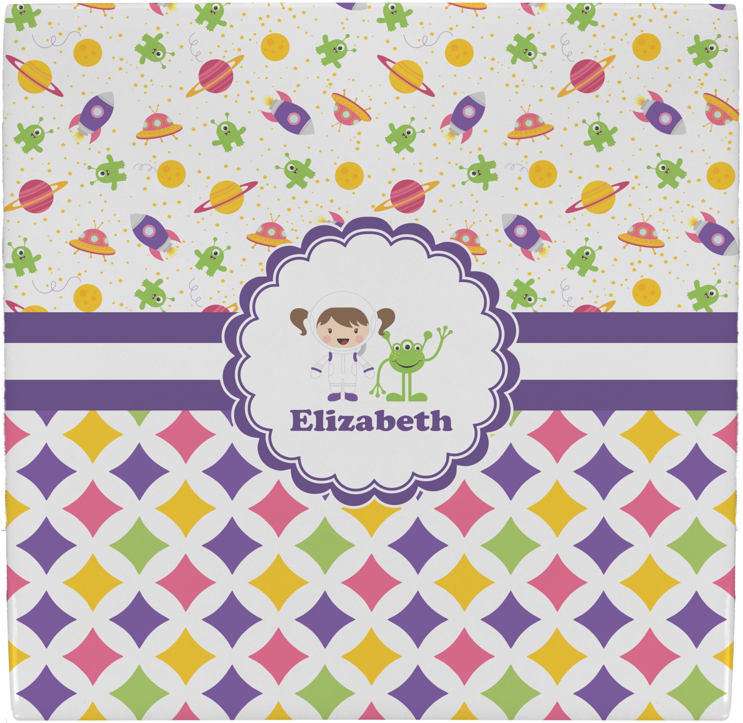 Girls love space exploration too. We have used our popular space design full of little green martians, purple and pink spaceships, yellow and pink planets, and yellow stars galore and paired it with a whimsical diamond pattern using coordinating colors.