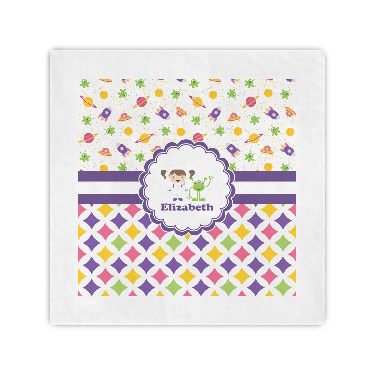 Girls love space exploration too. We have used our popular space design full of little green martians, purple and pink spaceships, yellow and pink planets, and yellow stars galore and paired it with a whimsical diamond pattern using coordinating colors.