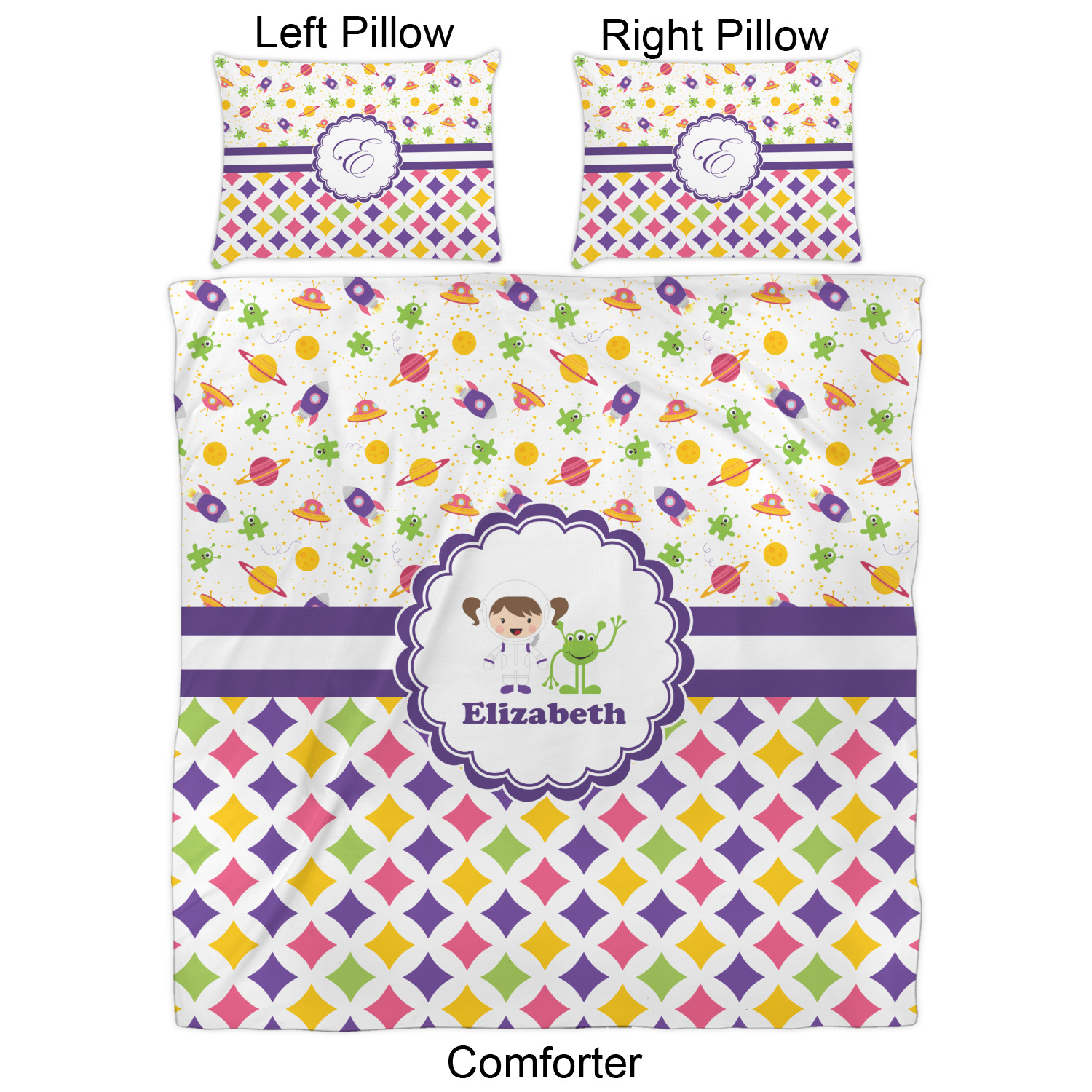 Girls love space exploration too. We have used our popular space design full of little green martians, purple and pink spaceships, yellow and pink planets, and yellow stars galore and paired it with a whimsical diamond pattern using coordinating colors.