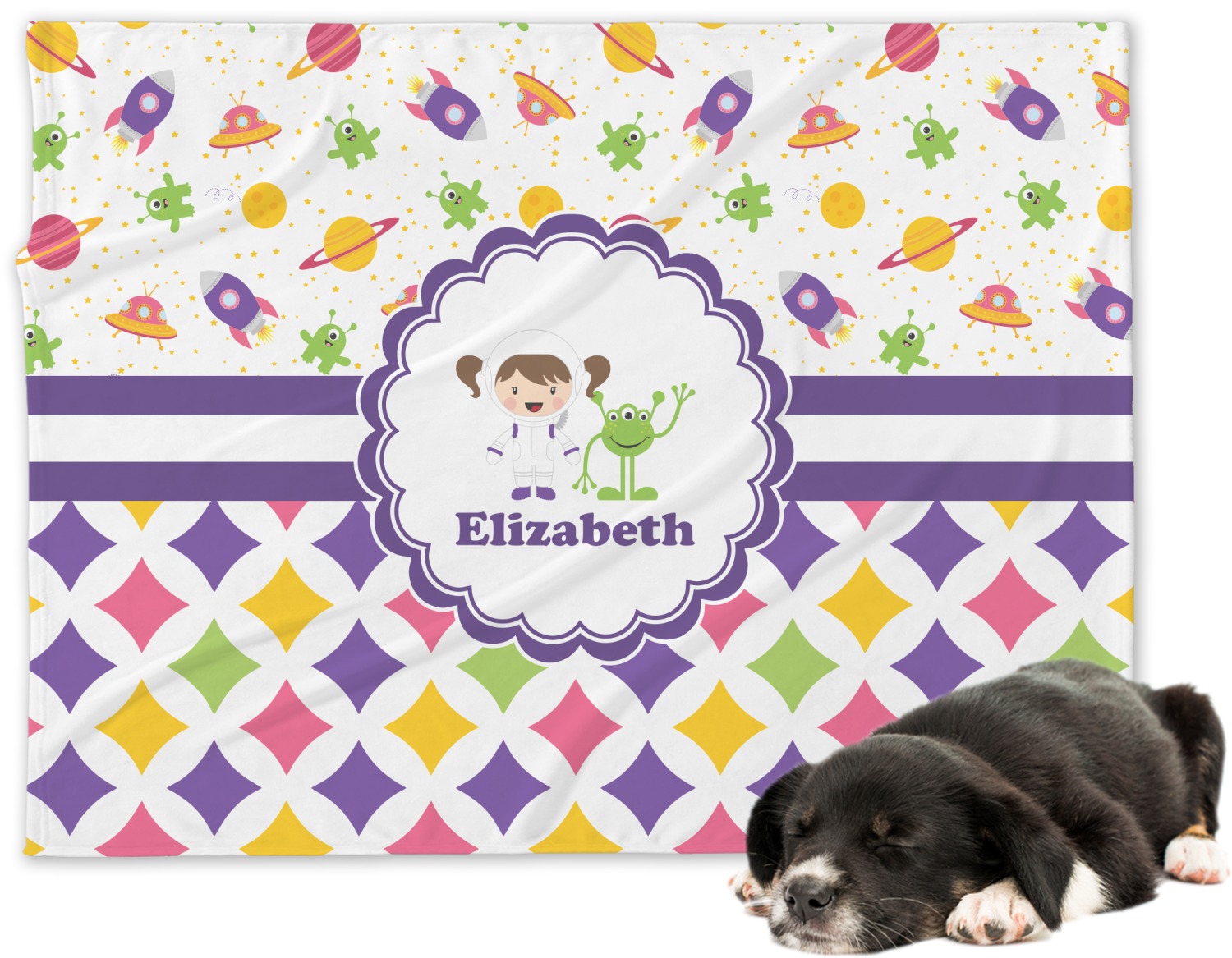 Girls love space exploration too. We have used our popular space design full of little green martians, purple and pink spaceships, yellow and pink planets, and yellow stars galore and paired it with a whimsical diamond pattern using coordinating colors.