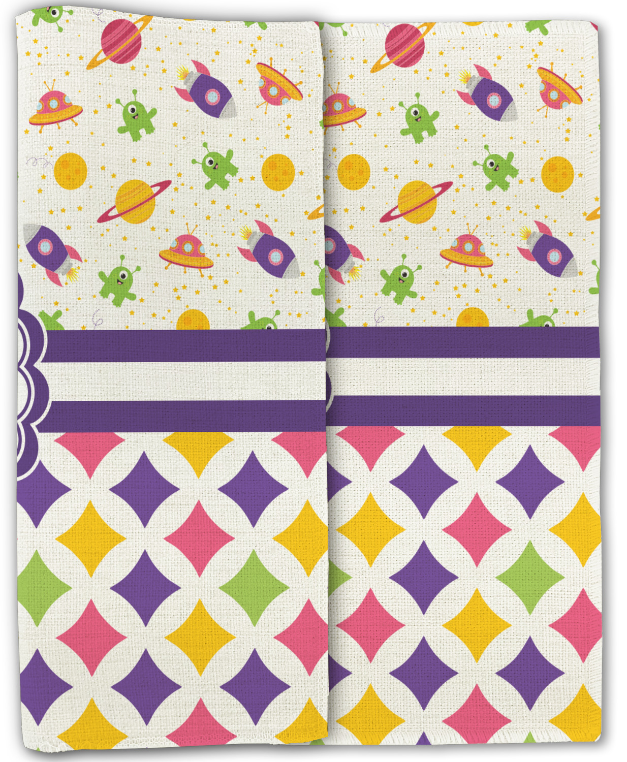 Girls love space exploration too. We have used our popular space design full of little green martians, purple and pink spaceships, yellow and pink planets, and yellow stars galore and paired it with a whimsical diamond pattern using coordinating colors.