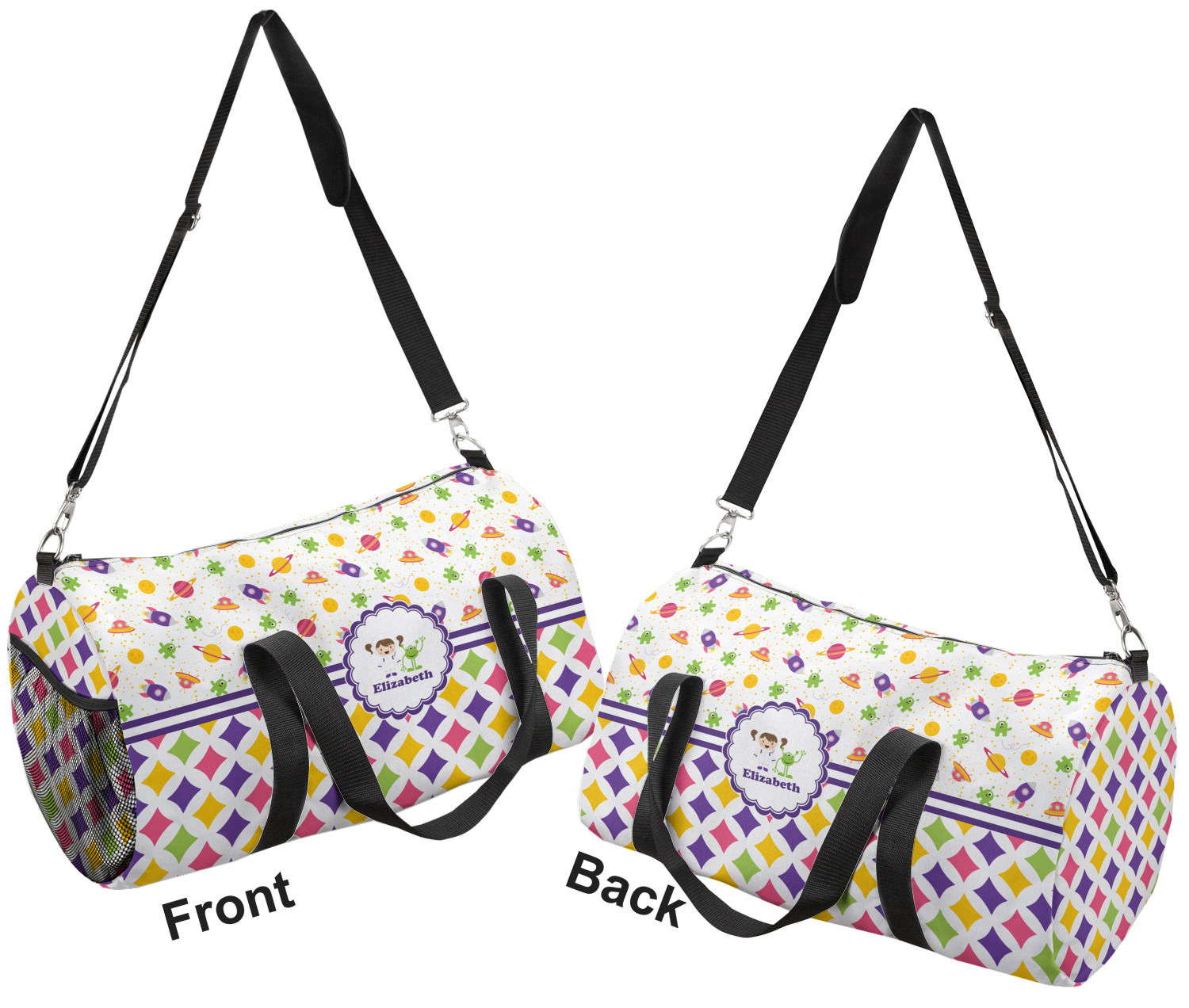 This duffle is a sturdy bag made of a canvas material. It comes in two sizes: Small (19"W x 9.5"H x 9.5"D) and Large (23"W x 12"H x 12"D). The bag is a cylindrical shape with a black adjustable strap and two handles. On one side is an elastic pouch to put a waterbottle or other small item. Your product will be sublimated with your design and is able to be designed on the front, back, and sides. Be sure to remember that the straps may cut into parts of your design if you upload your own artwork.