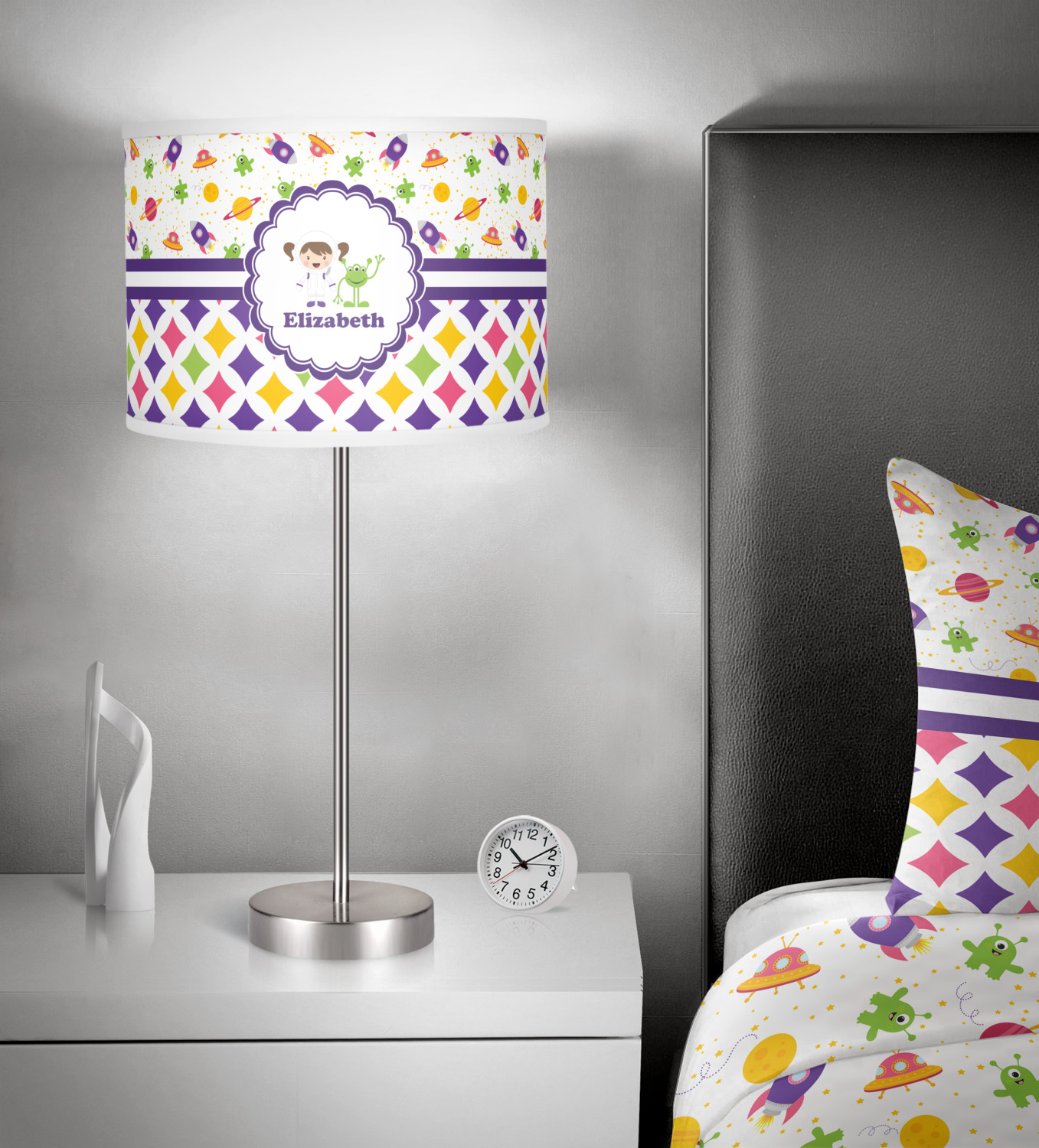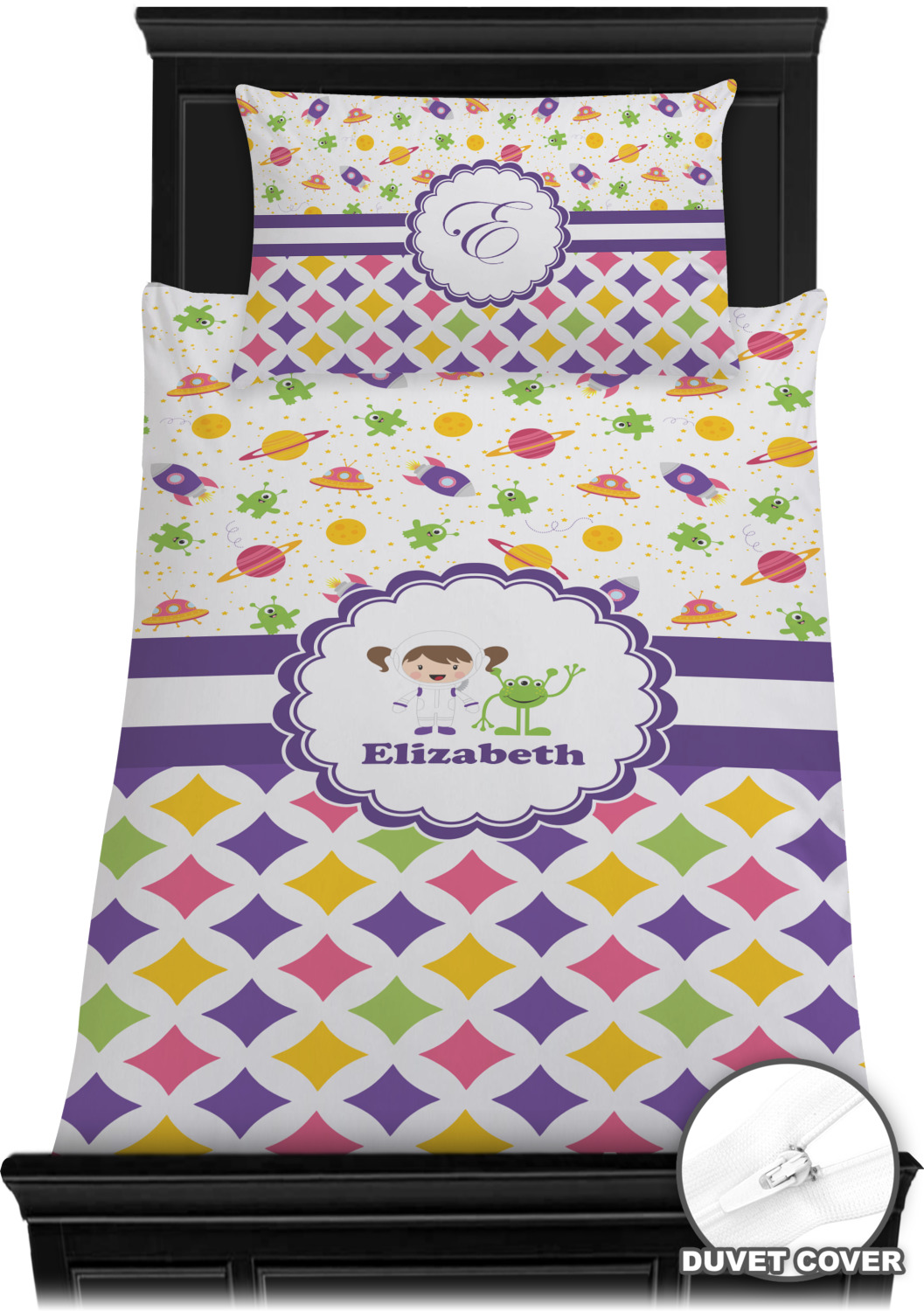 Girls love space exploration too. We have used our popular space design full of little green martians, purple and pink spaceships, yellow and pink planets, and yellow stars galore and paired it with a whimsical diamond pattern using coordinating colors.