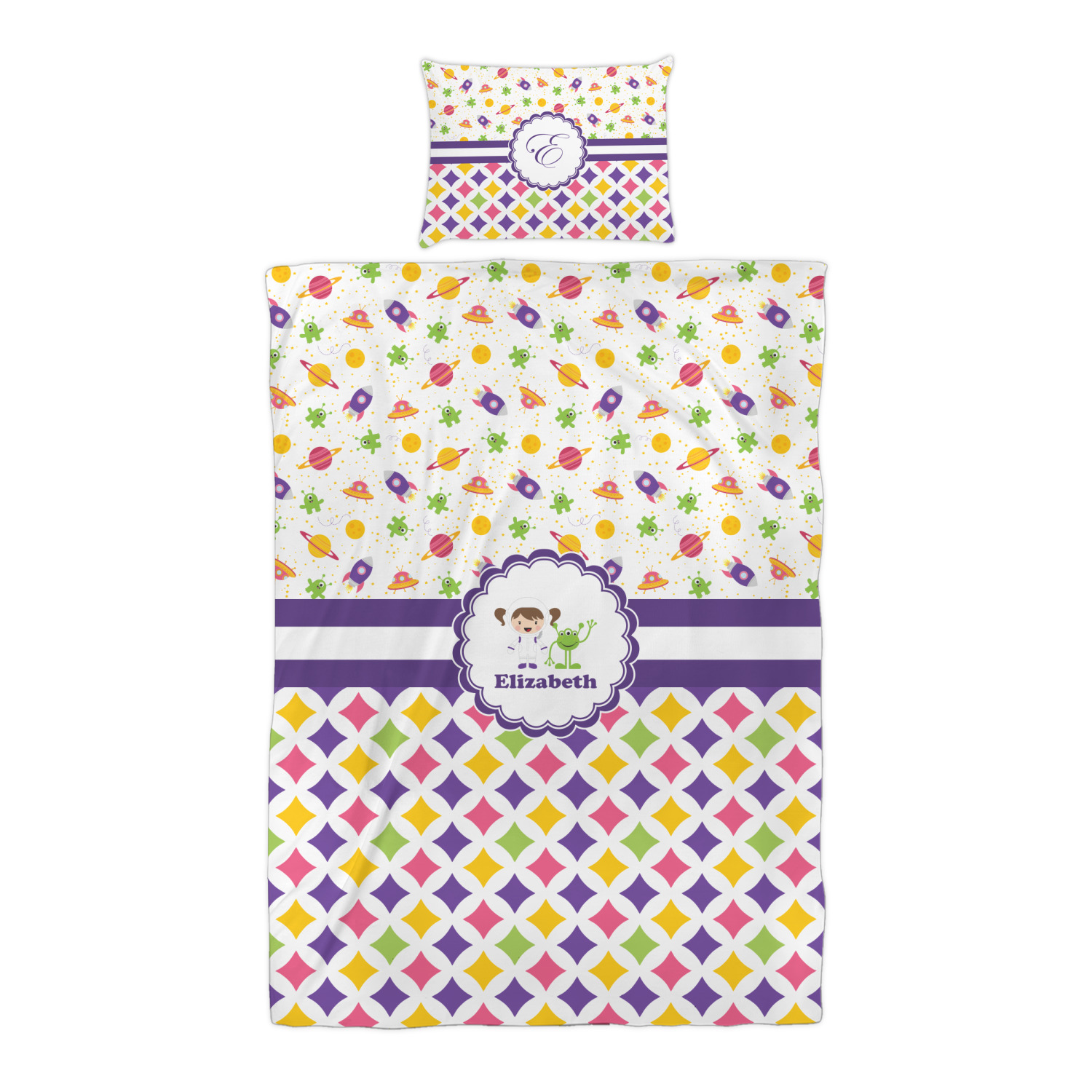 Girls love space exploration too. We have used our popular space design full of little green martians, purple and pink spaceships, yellow and pink planets, and yellow stars galore and paired it with a whimsical diamond pattern using coordinating colors.