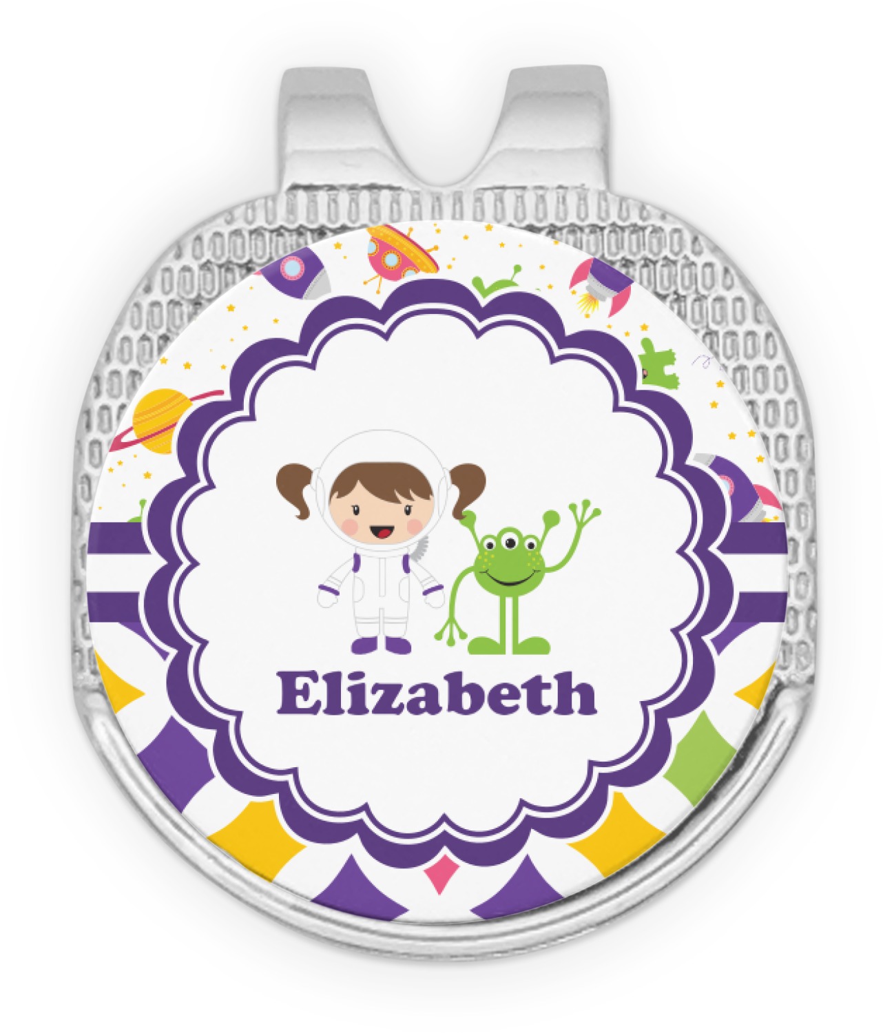 A wide white band trimmed in purple highlights the scallop label showcasing the little girl and her favorite martian personalized with your little one's name.