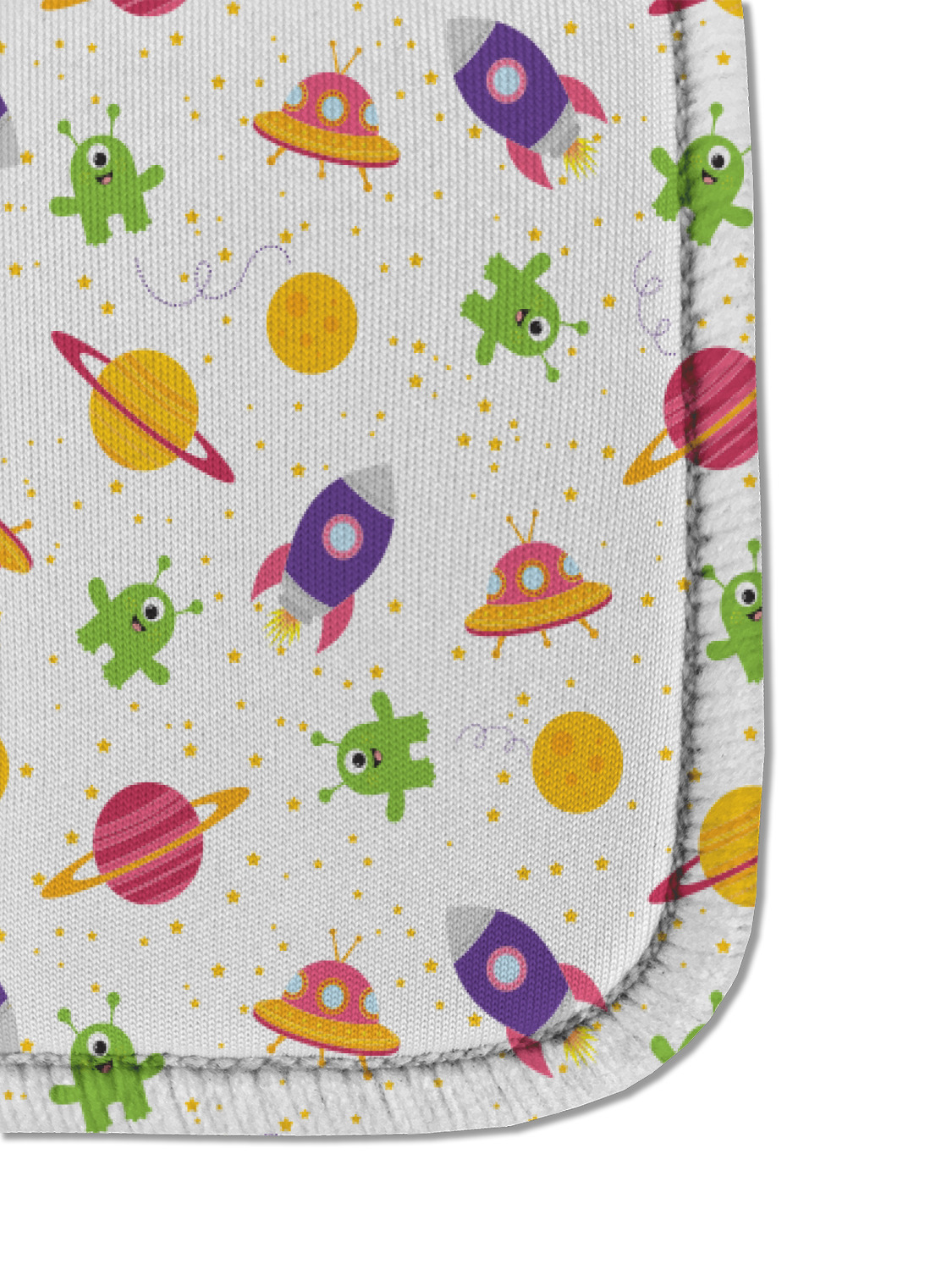 Girls love space exploration too. We have used our popular space design full of little green martians, purple and pink spaceships, yellow and pink planets, and yellow stars galore and paired it with a whimsical diamond pattern using coordinating colors.