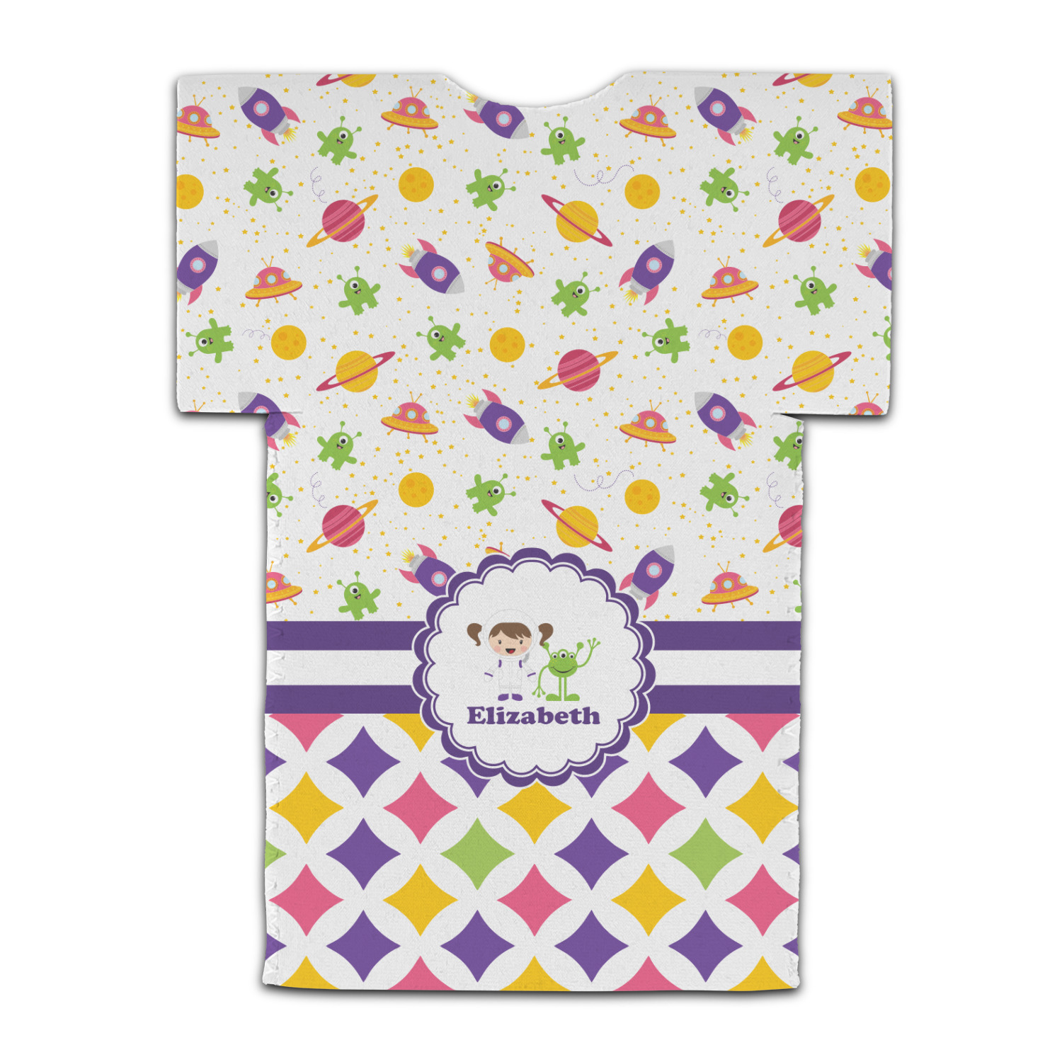 A wide white band trimmed in purple highlights the scallop label showcasing the little girl and her favorite martian personalized with your little one's name.