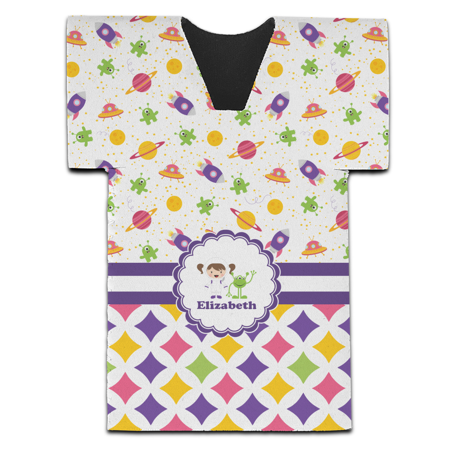 A wide white band trimmed in purple highlights the scallop label showcasing the little girl and her favorite martian personalized with your little one's name.