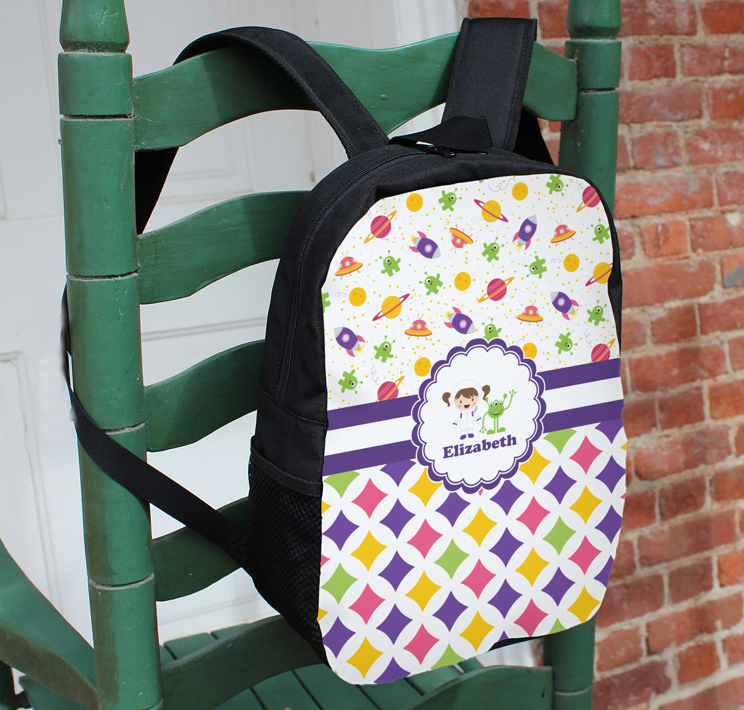 These small backpacks are made of a durable black canvas material with your personalization right on the front. The two shoulder straps are padded and easily adjustable. The bag itself measures at about 11" W x 15" H x 5" D. It's the perfect size for elementary aged kids or adults who want a smaller backpack. On the top of the bag you will find a handle to hang or carry your backpack by as well as a large zipper closure to keep all of your belongings safe inside. On each side of your backpack is a mesh pocket for a small item or water bottle. Inside your backpack you will find a spacious area with a small zipper pocket and a padded laptop slot that will fit up to a 13" laptop (13" being very snug). This is the perfect bag for any student that needs a couple books and their laptop with them at all times. It also works great as a carry on for traveling!