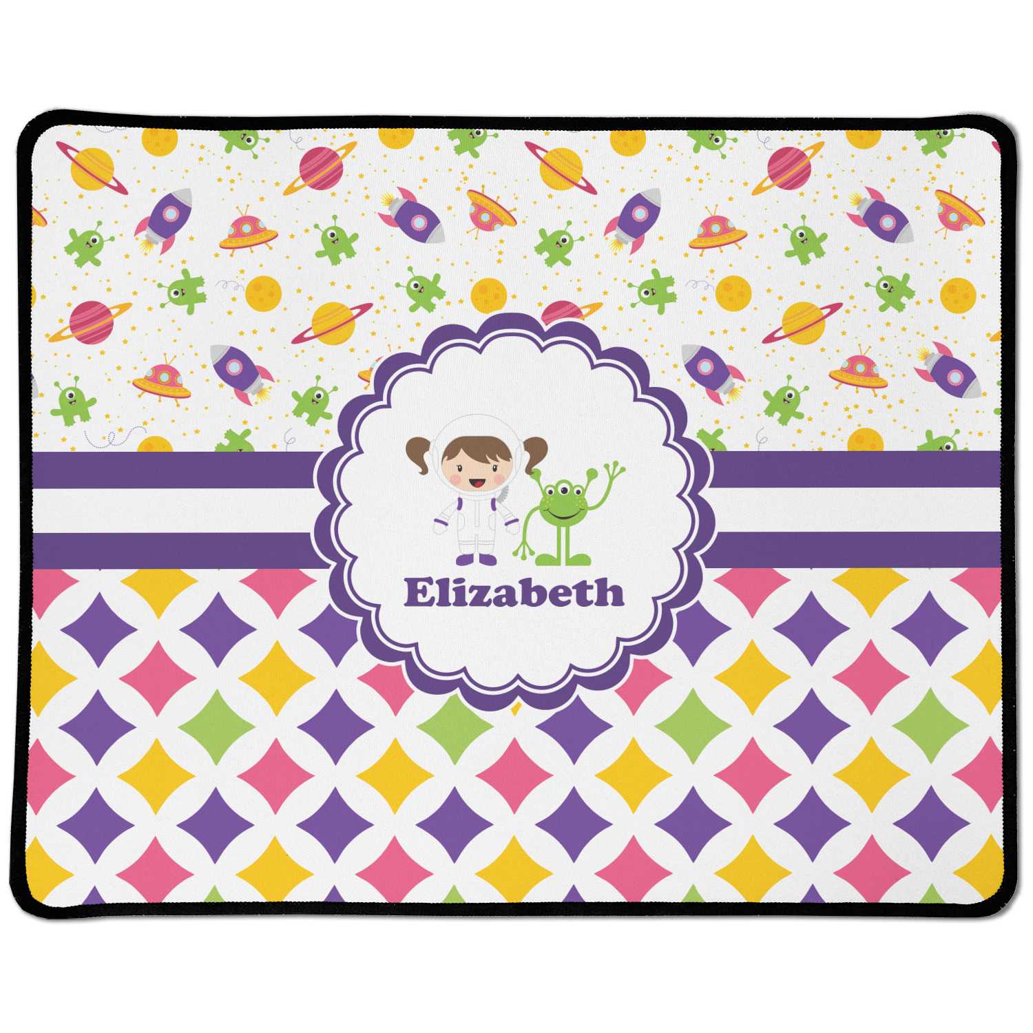 Girls love space exploration too. We have used our popular space design full of little green martians, purple and pink spaceships, yellow and pink planets, and yellow stars galore and paired it with a whimsical diamond pattern using coordinating colors.