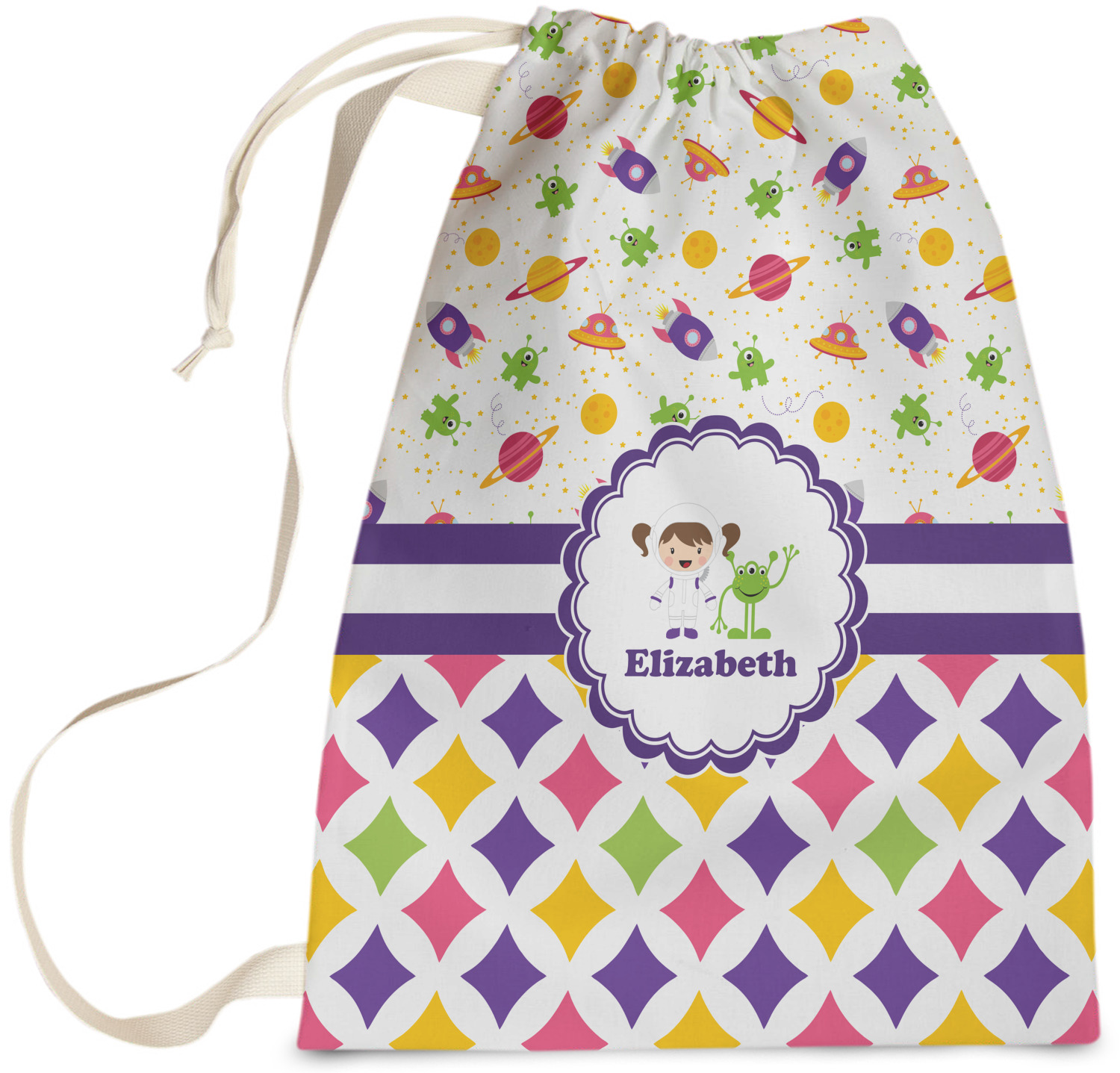 Girls love space exploration too. We have used our popular space design full of little green martians, purple and pink spaceships, yellow and pink planets, and yellow stars galore and paired it with a whimsical diamond pattern using coordinating colors.