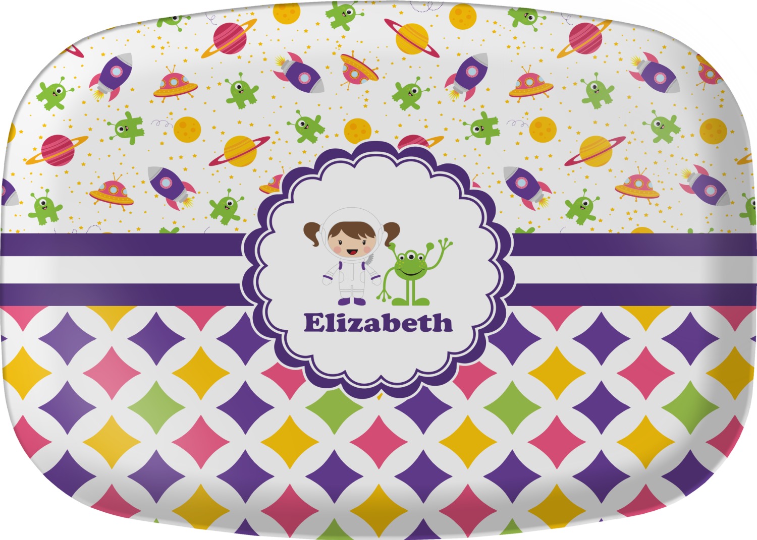 A wide white band trimmed in purple highlights the scallop label showcasing the little girl and her favorite martian personalized with your little one's name.