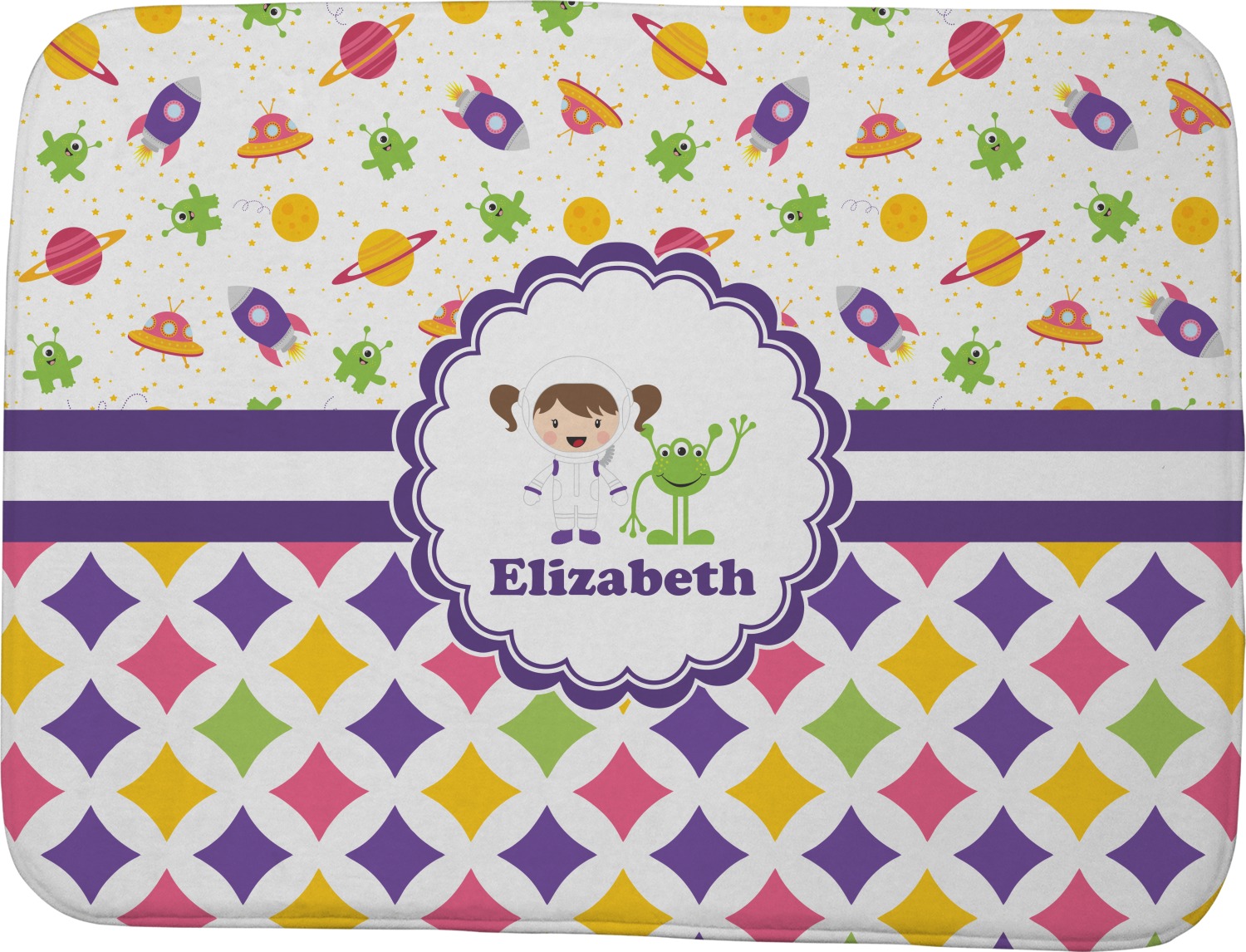 Girls love space exploration too. We have used our popular space design full of little green martians, purple and pink spaceships, yellow and pink planets, and yellow stars galore and paired it with a whimsical diamond pattern using coordinating colors.
