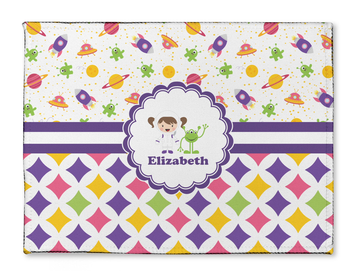 Girls love space exploration too. We have used our popular space design full of little green martians, purple and pink spaceships, yellow and pink planets, and yellow stars galore and paired it with a whimsical diamond pattern using coordinating colors.