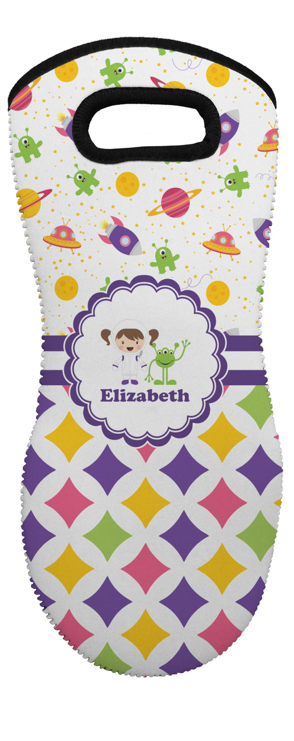 These heat resistant gloves are made entirely of a durable neoprene; the front features a softer texture, while the palm's side has a textured surface, meant to handle heat up to 500 degrees Fahrenheit. Thick, heavy duty stitching connects the two sides. A small, oval cutout appears on the front, and can be used to hang and store the mitt. Your personalization appears on the front, and the upper part of the back of the mitt. The style of these oven mitts are suitable for both the right and left hand, depending on your needs. If you need one for each hand, be sure to order two!
