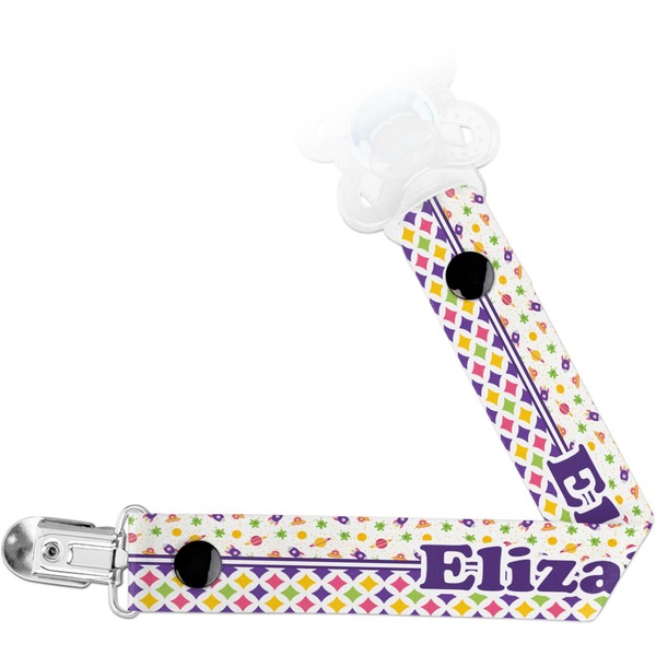 This personalized pacifier clip is the ideal size and measures at approximately 7.5 inches in length, when either end is snapped closed. On one end, you'll find a snap button. This button of your baby's pacifier holder is what can be attached to their pacifier to hold is securely in place. Simply open the snap, slip it through the pacifier opening, and snap it back into place. On the opposite end of this baby pacifier holder, you'll find a metal clip that can secure to a baby's collar or sleeve. This clip ensures that the strap stays in place, and that your baby's pacifier is always on hand.
