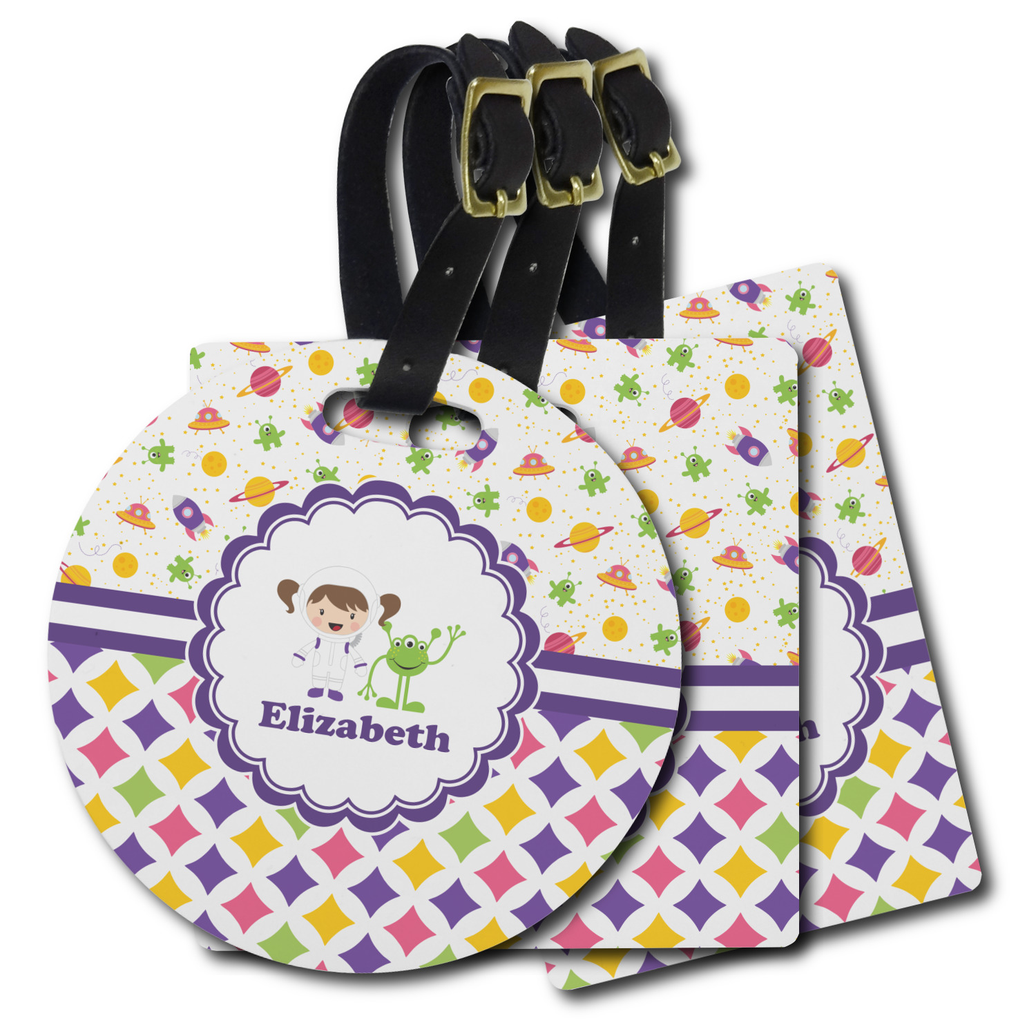 These personalized bag tags are sold in a variety of shapes, so that you may find the product that meets your vision exactly. We sell a round luggage tag, which measures at approximately 4" x 4". Our square luggage tag is about 3.5" x 3.5", while our rectangular version is 2.75" x 4 ".