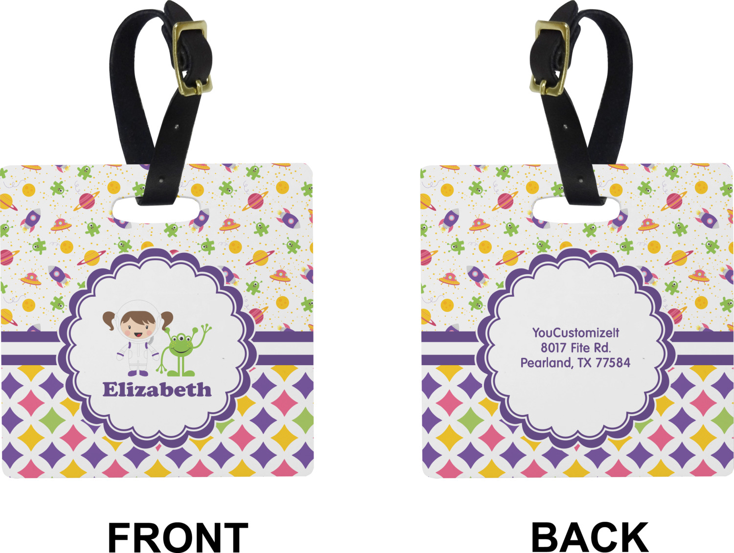 These cute luggage tags are made of a fiber-reinforced, UV-resistant plastic, making them waterproof and durable enough for both everyday use and the rugged adventures of any traveler! A leather strap with holes and a buckle is included with your purchase and can be used to attach your custom luggage tag to any suitcase, backpack, or duffel bag. You can design these travel tags as you wish; your customization will be displayed across the front, while the back will show as little or as much personal information as you want.