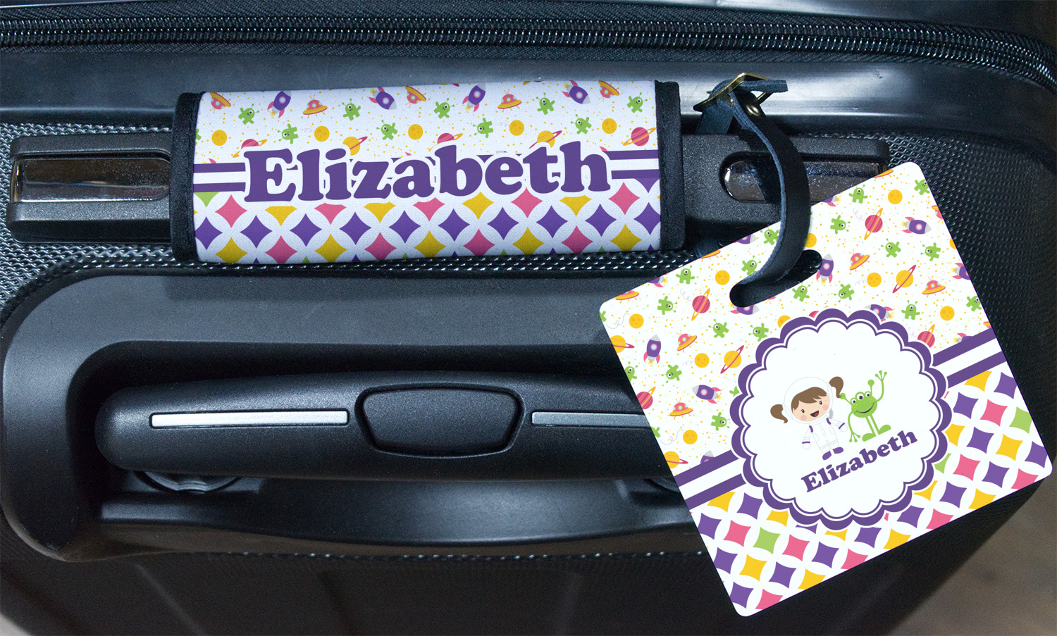 A wide white band trimmed in purple highlights the scallop label showcasing the little girl and her favorite martian personalized with your little one's name.