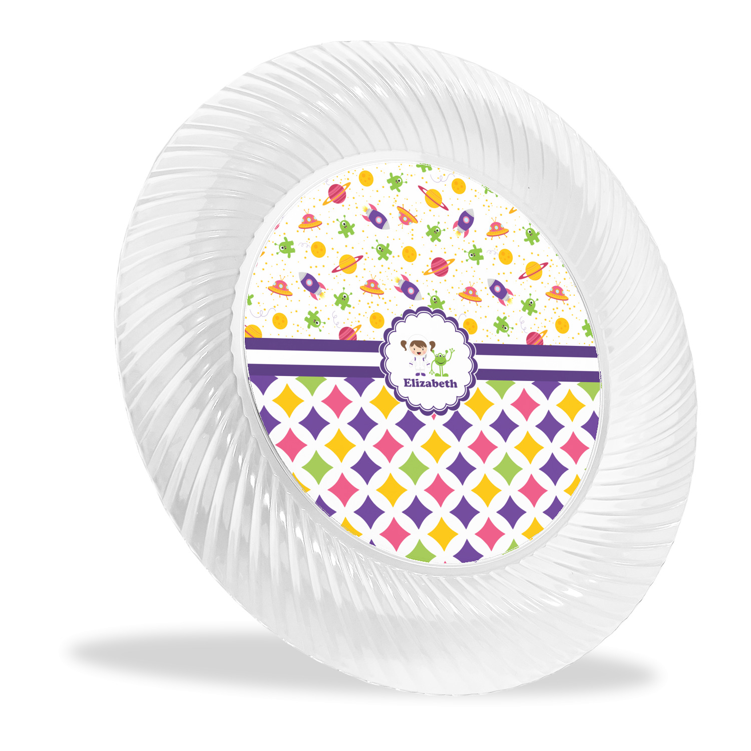 Made from a beautiful clear plastic plate as a base, your design is printed to the underside of the plate. The outside of these disposable plates has a classic swirl texture to it for a high quality look and feel.