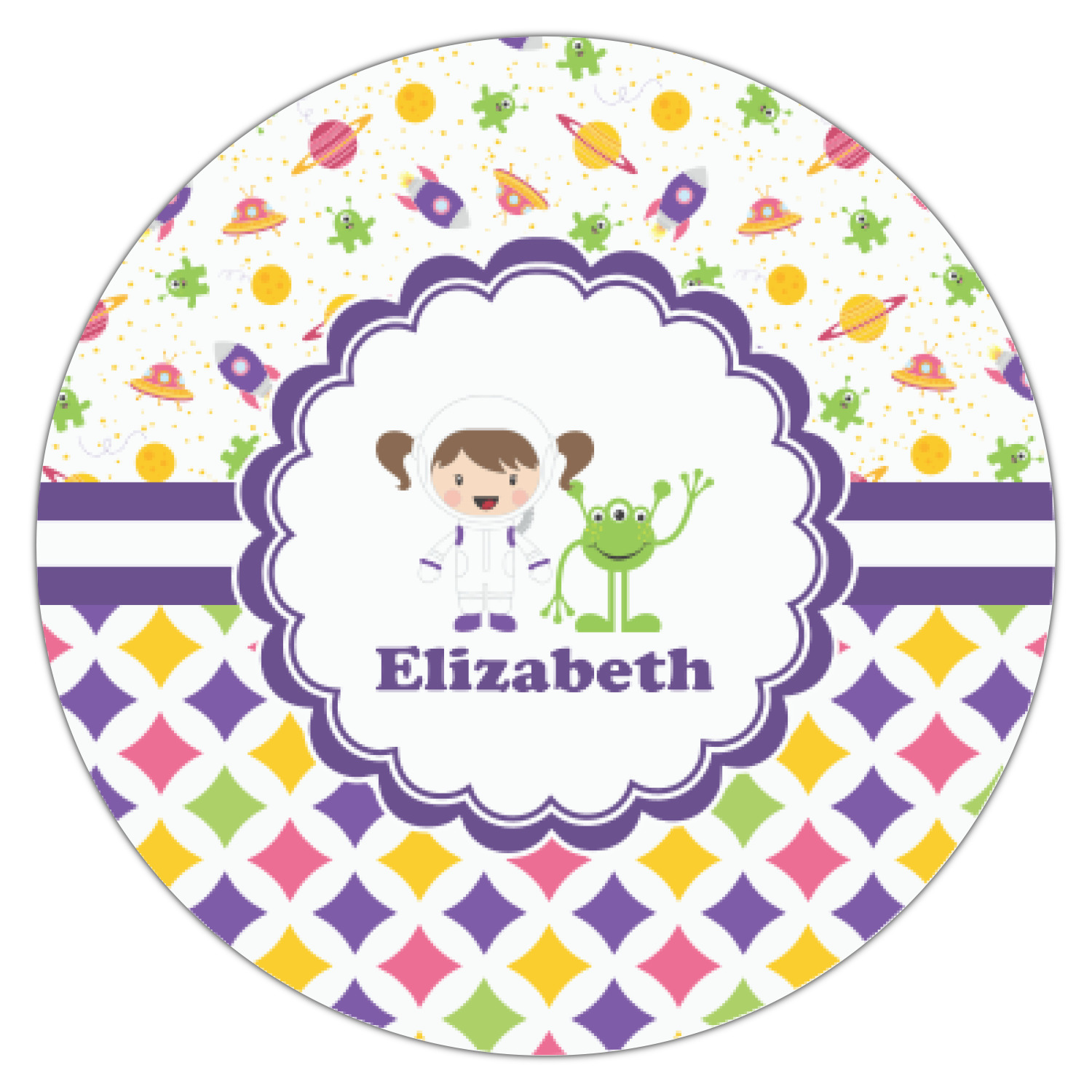 A wide white band trimmed in purple highlights the scallop label showcasing the little girl and her favorite martian personalized with your little one's name.