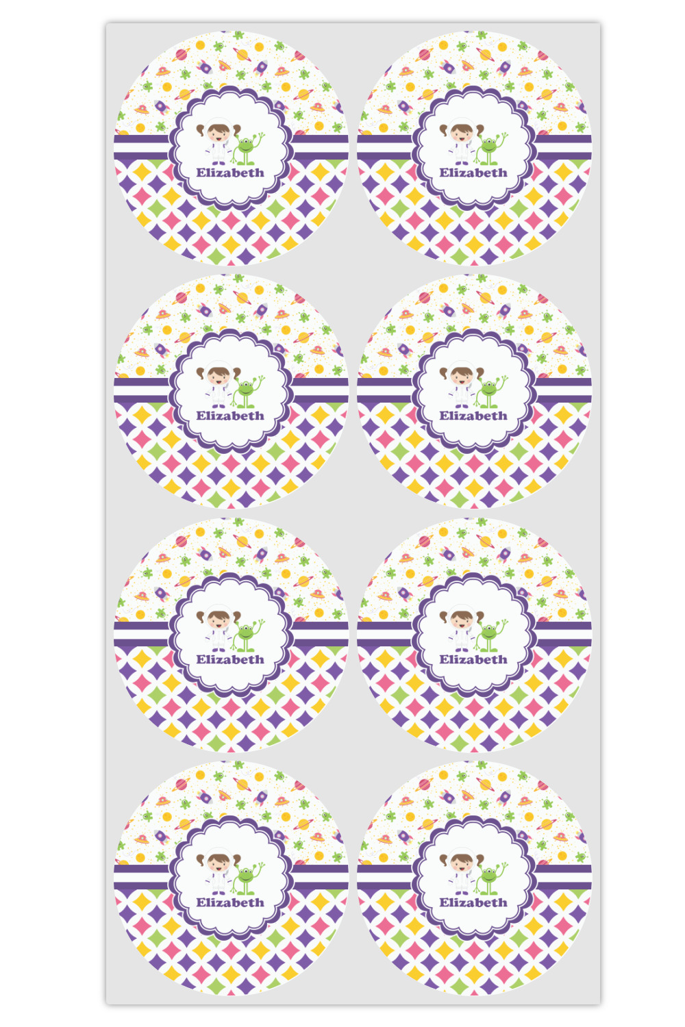 A wide white band trimmed in purple highlights the scallop label showcasing the little girl and her favorite martian personalized with your little one's name.