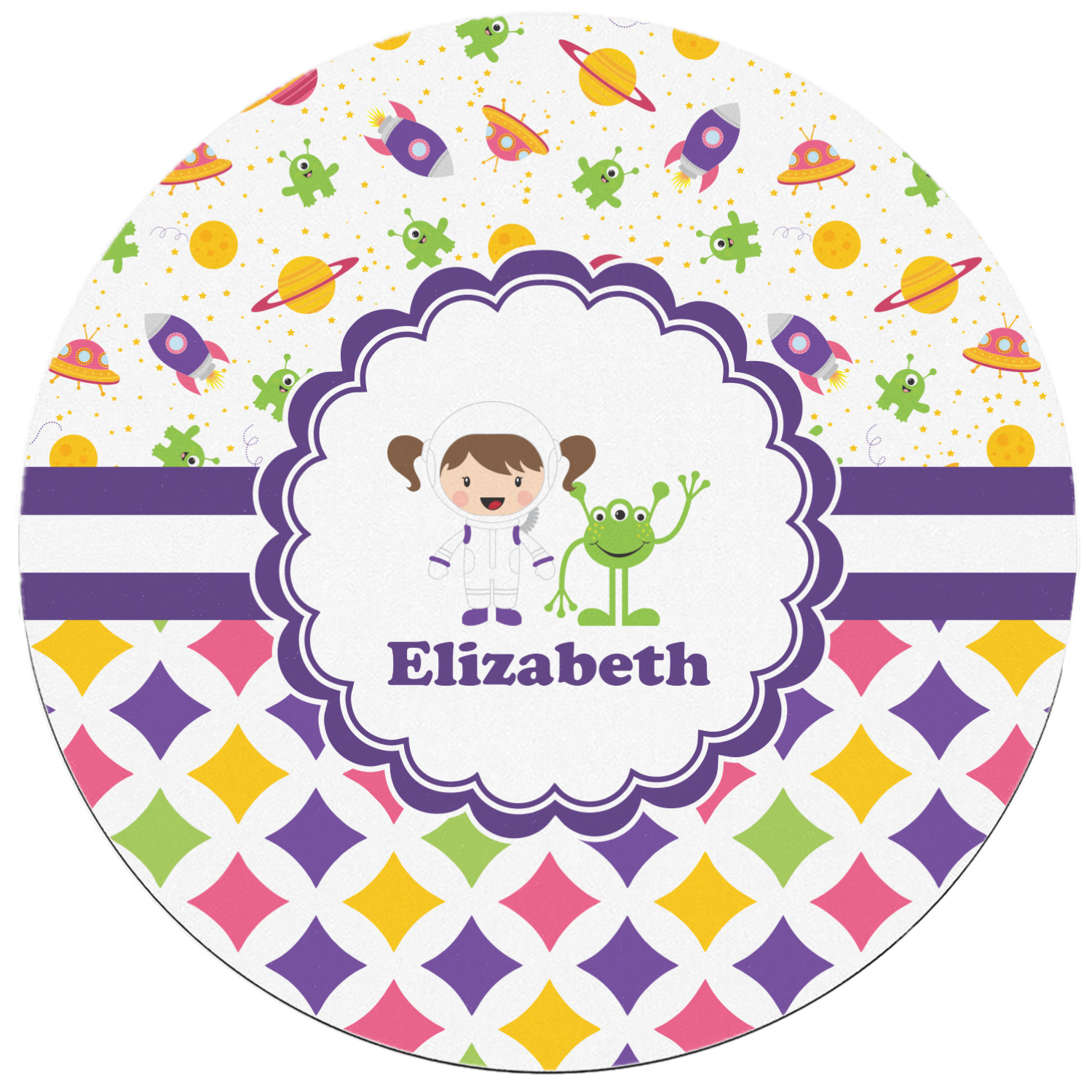 A wide white band trimmed in purple highlights the scallop label showcasing the little girl and her favorite martian personalized with your little one's name.