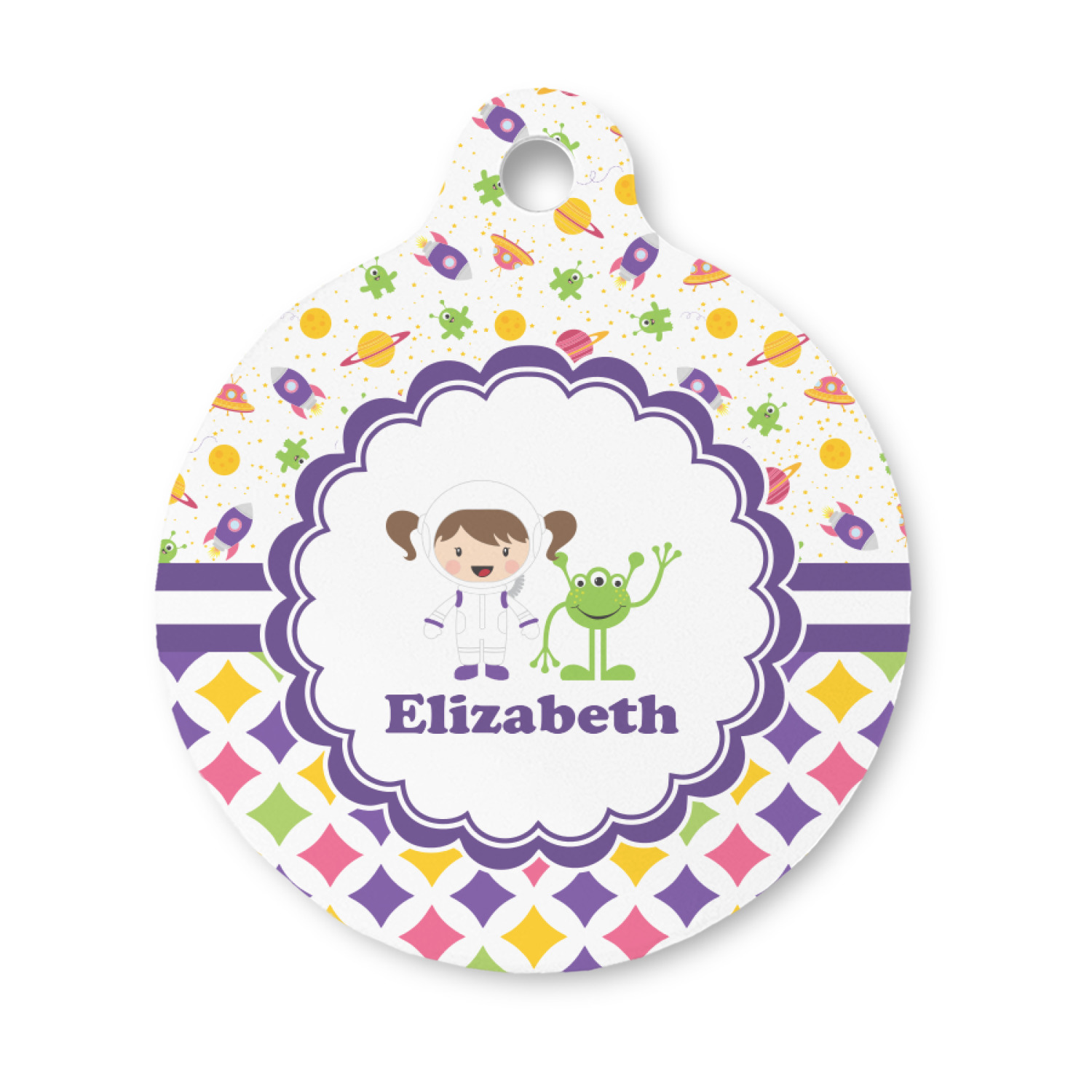 A wide white band trimmed in purple highlights the scallop label showcasing the little girl and her favorite martian personalized with your little one's name.