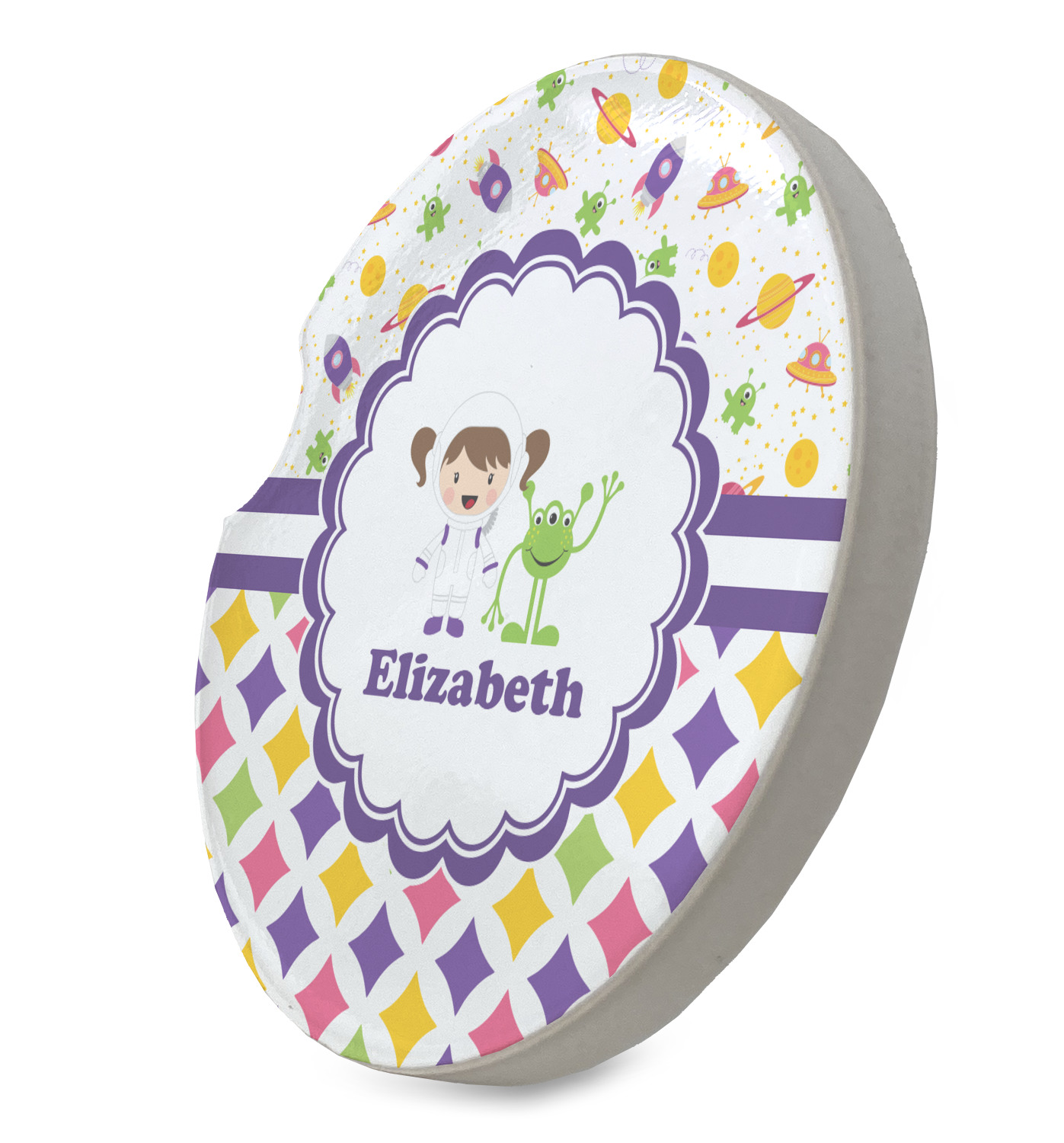 A wide white band trimmed in purple highlights the scallop label showcasing the little girl and her favorite martian personalized with your little one's name.