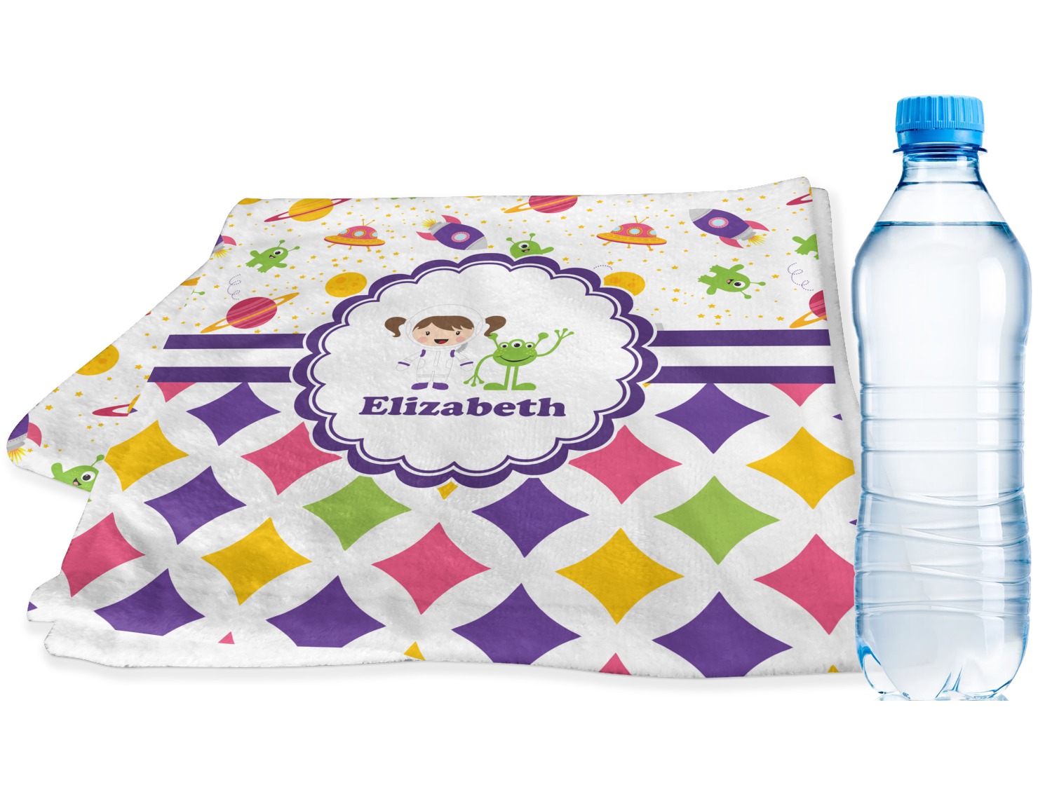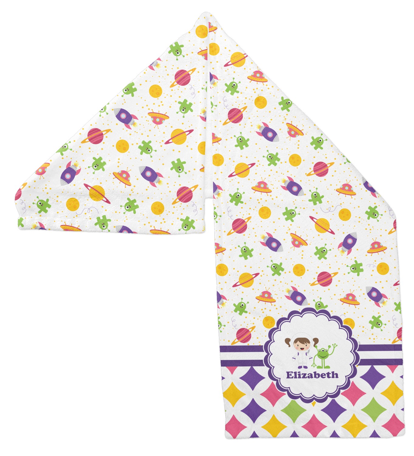 Girls love space exploration too. We have used our popular space design full of little green martians, purple and pink spaceships, yellow and pink planets, and yellow stars galore and paired it with a whimsical diamond pattern using coordinating colors.