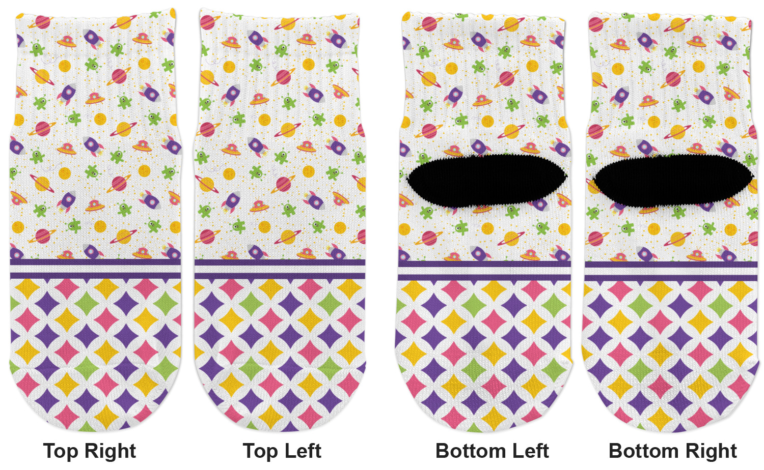 Girls love space exploration too. We have used our popular space design full of little green martians, purple and pink spaceships, yellow and pink planets, and yellow stars galore and paired it with a whimsical diamond pattern using coordinating colors.