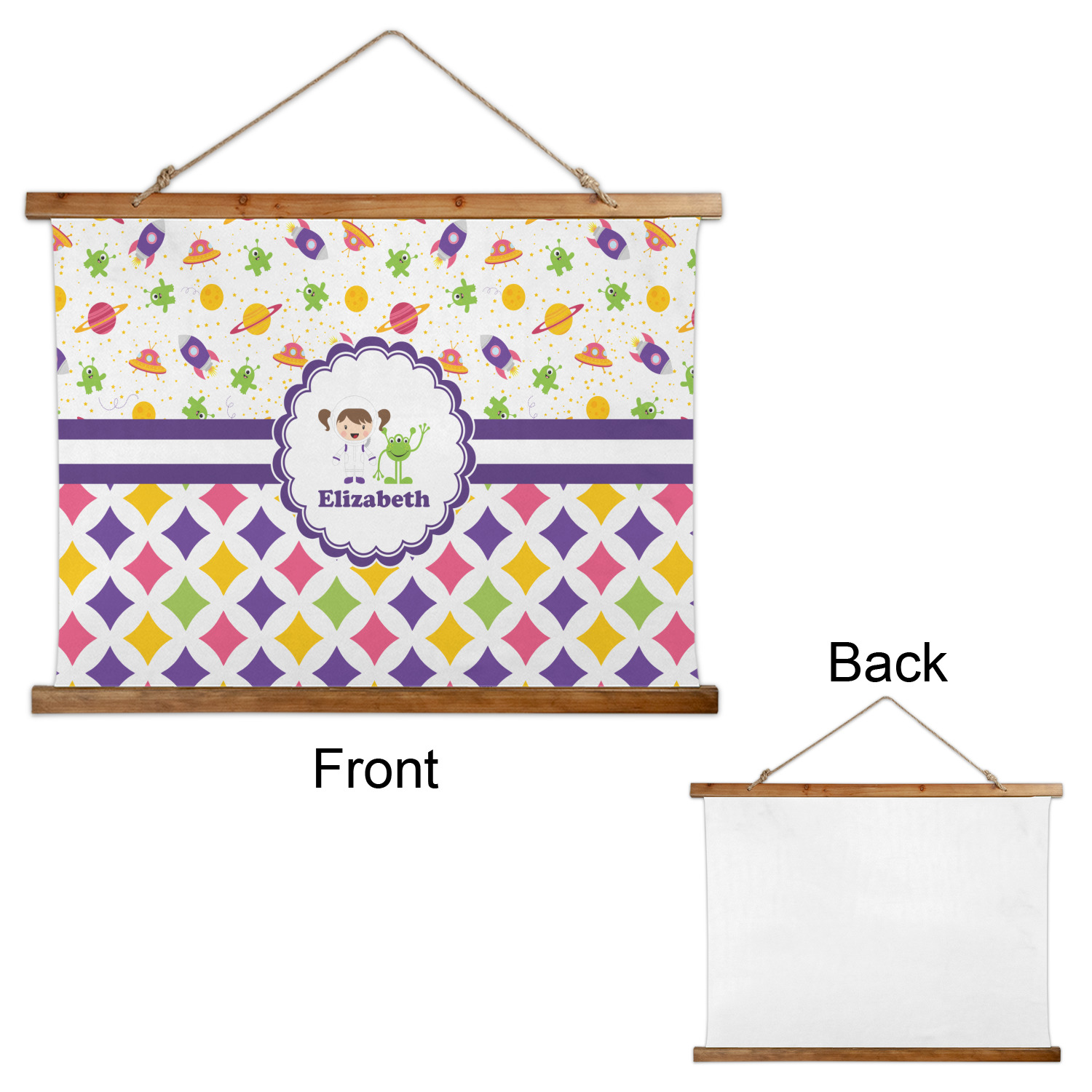 Girls love space exploration too. We have used our popular space design full of little green martians, purple and pink spaceships, yellow and pink planets, and yellow stars galore and paired it with a whimsical diamond pattern using coordinating colors.