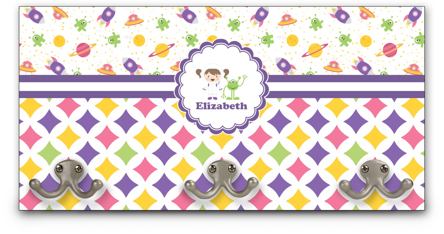 Girls love space exploration too. We have used our popular space design full of little green martians, purple and pink spaceships, yellow and pink planets, and yellow stars galore and paired it with a whimsical diamond pattern using coordinating colors.