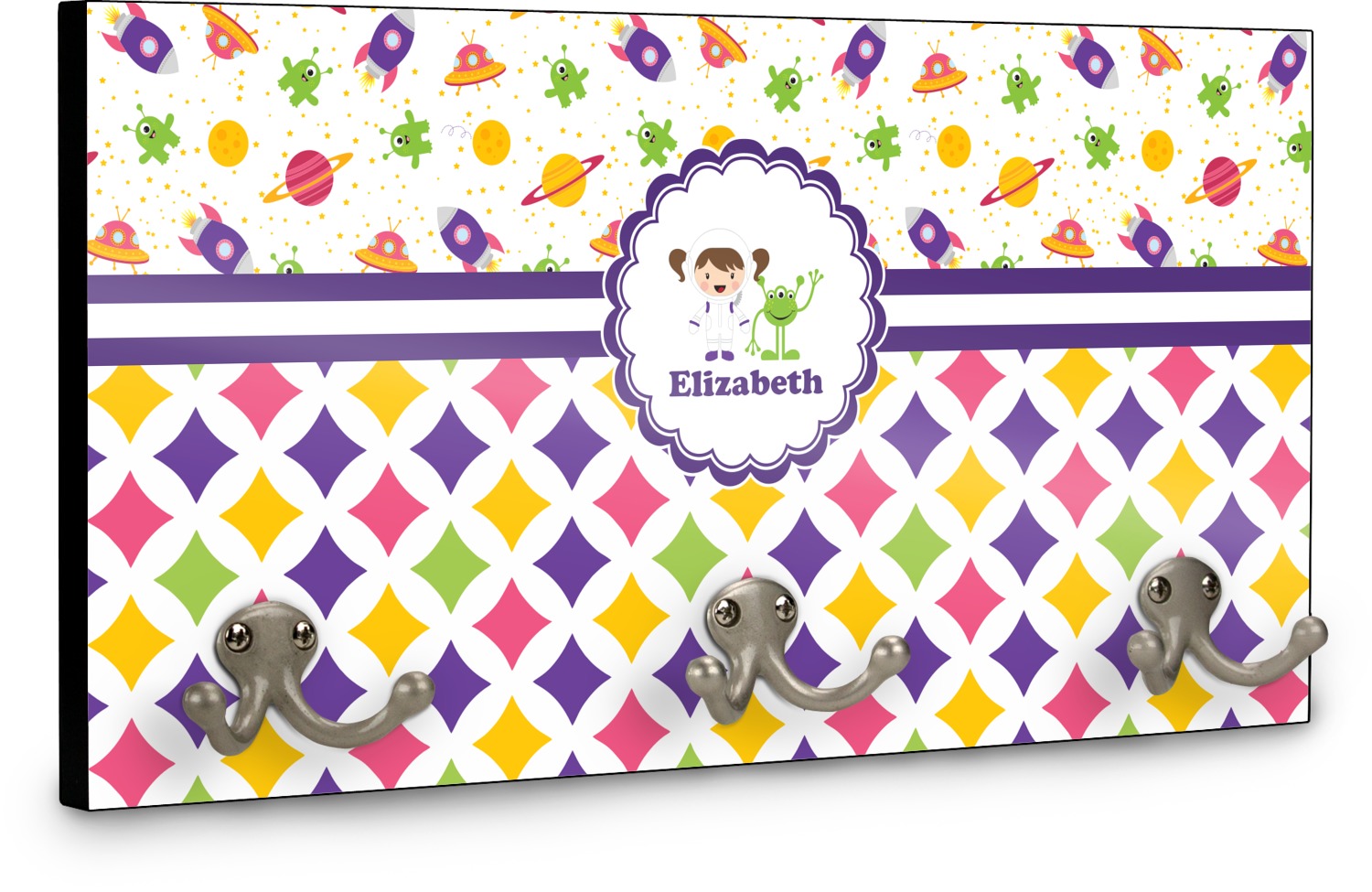 This coat rack is the perfect way to add some personality to your wall or entryway. The board is made of a strong maple that is approximately 16" x 8". The three 2-prong hooks are a sturdy metal that have three screws attaching them to the board. Your design is printed right onto the front of the board while the back and sides are a simple black.