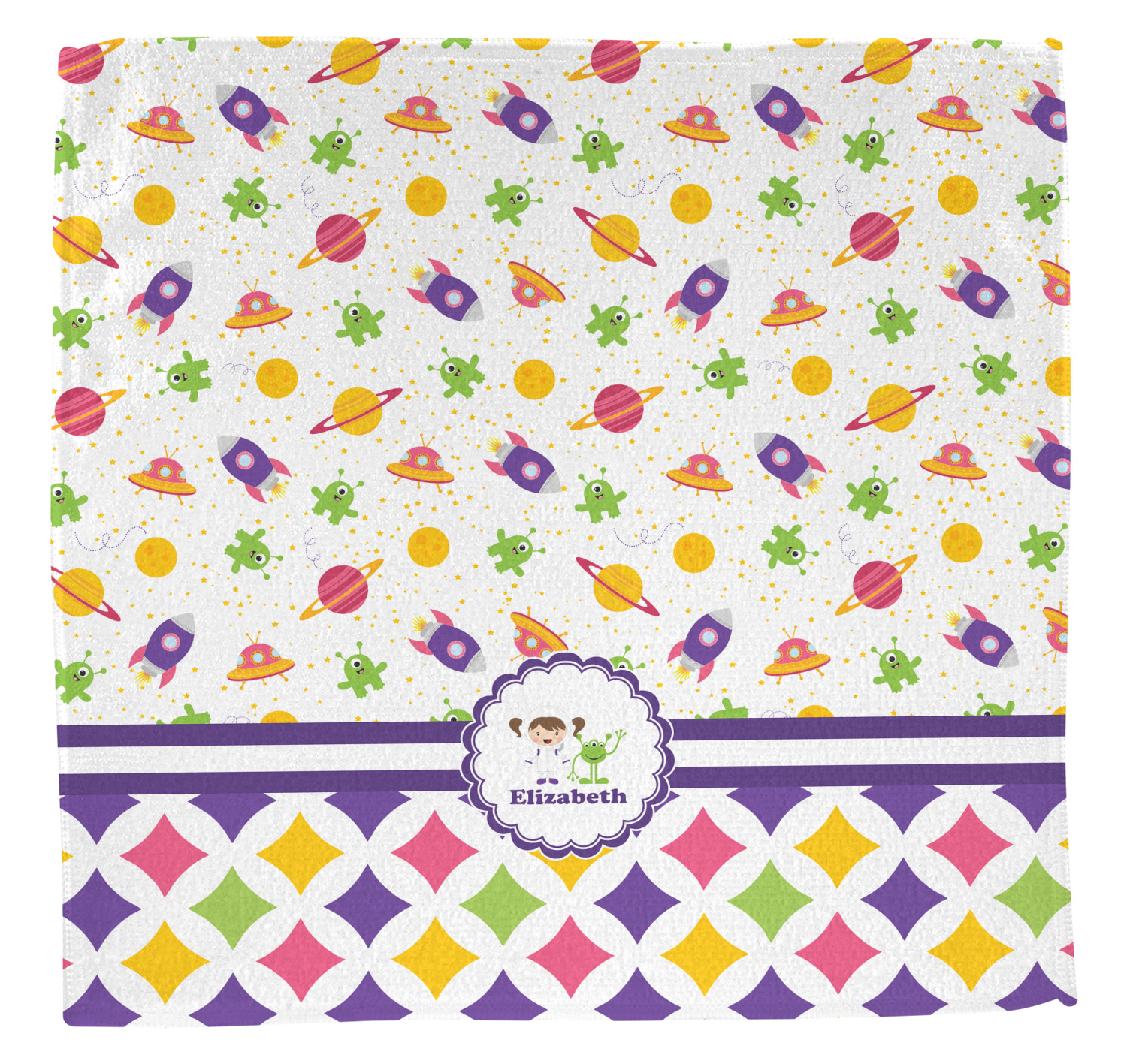 Girls love space exploration too. We have used our popular space design full of little green martians, purple and pink spaceships, yellow and pink planets, and yellow stars galore and paired it with a whimsical diamond pattern using coordinating colors.