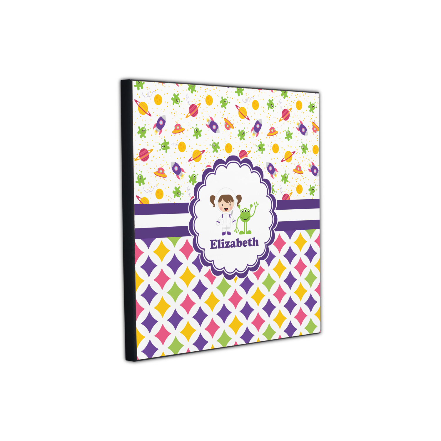 A wide white band trimmed in purple highlights the scallop label showcasing the little girl and her favorite martian personalized with your little one's name.