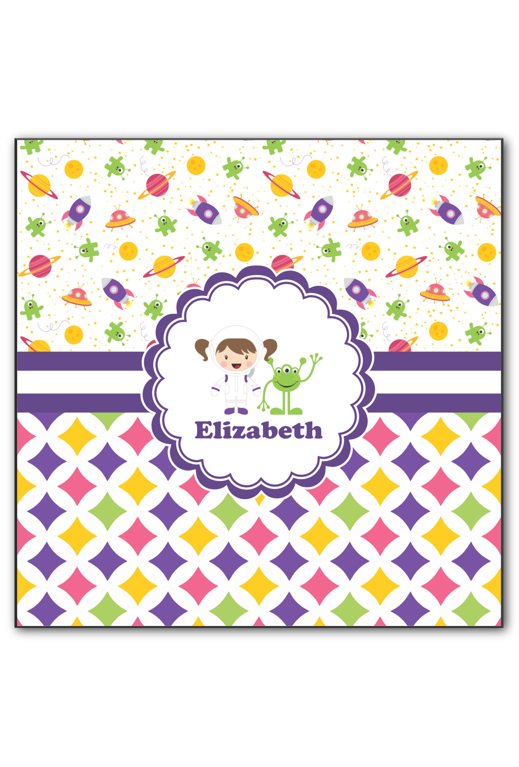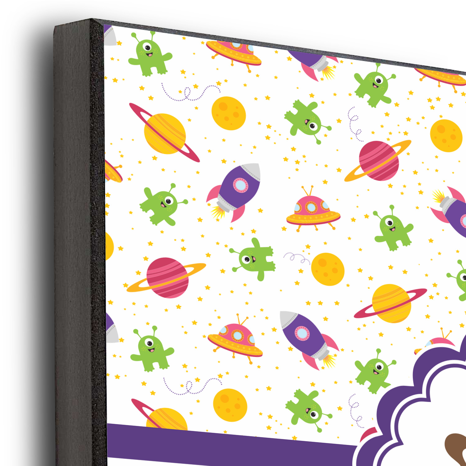Girls love space exploration too. We have used our popular space design full of little green martians, purple and pink spaceships, yellow and pink planets, and yellow stars galore and paired it with a whimsical diamond pattern using coordinating colors.