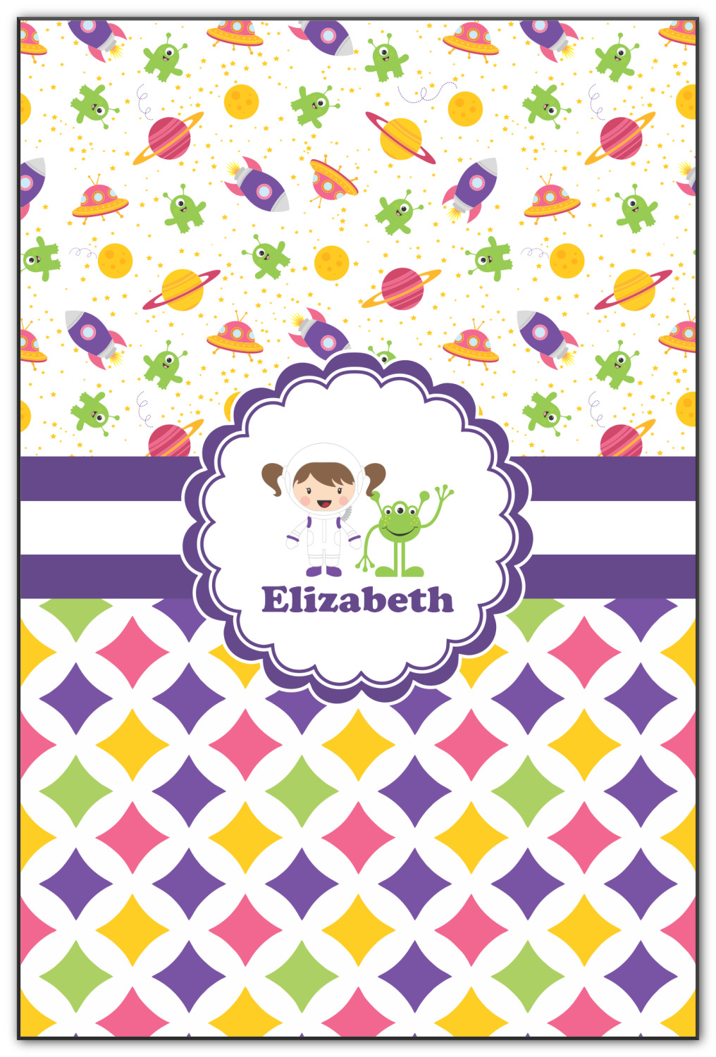 Girls love space exploration too. We have used our popular space design full of little green martians, purple and pink spaceships, yellow and pink planets, and yellow stars galore and paired it with a whimsical diamond pattern using coordinating colors.