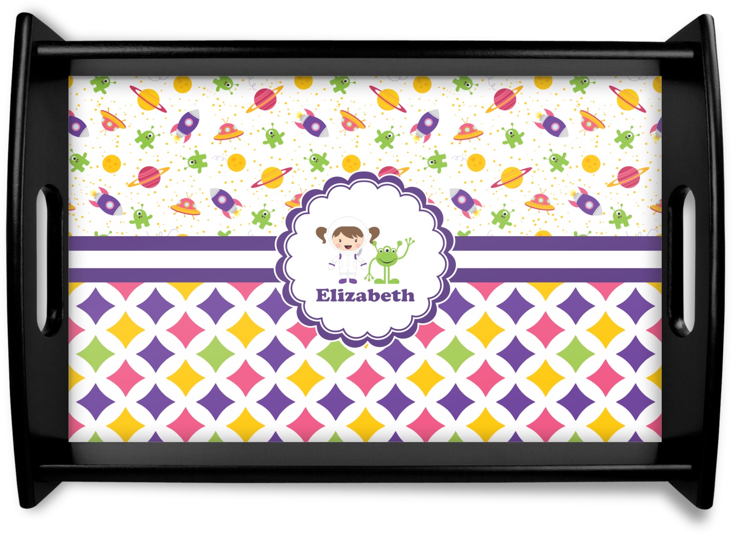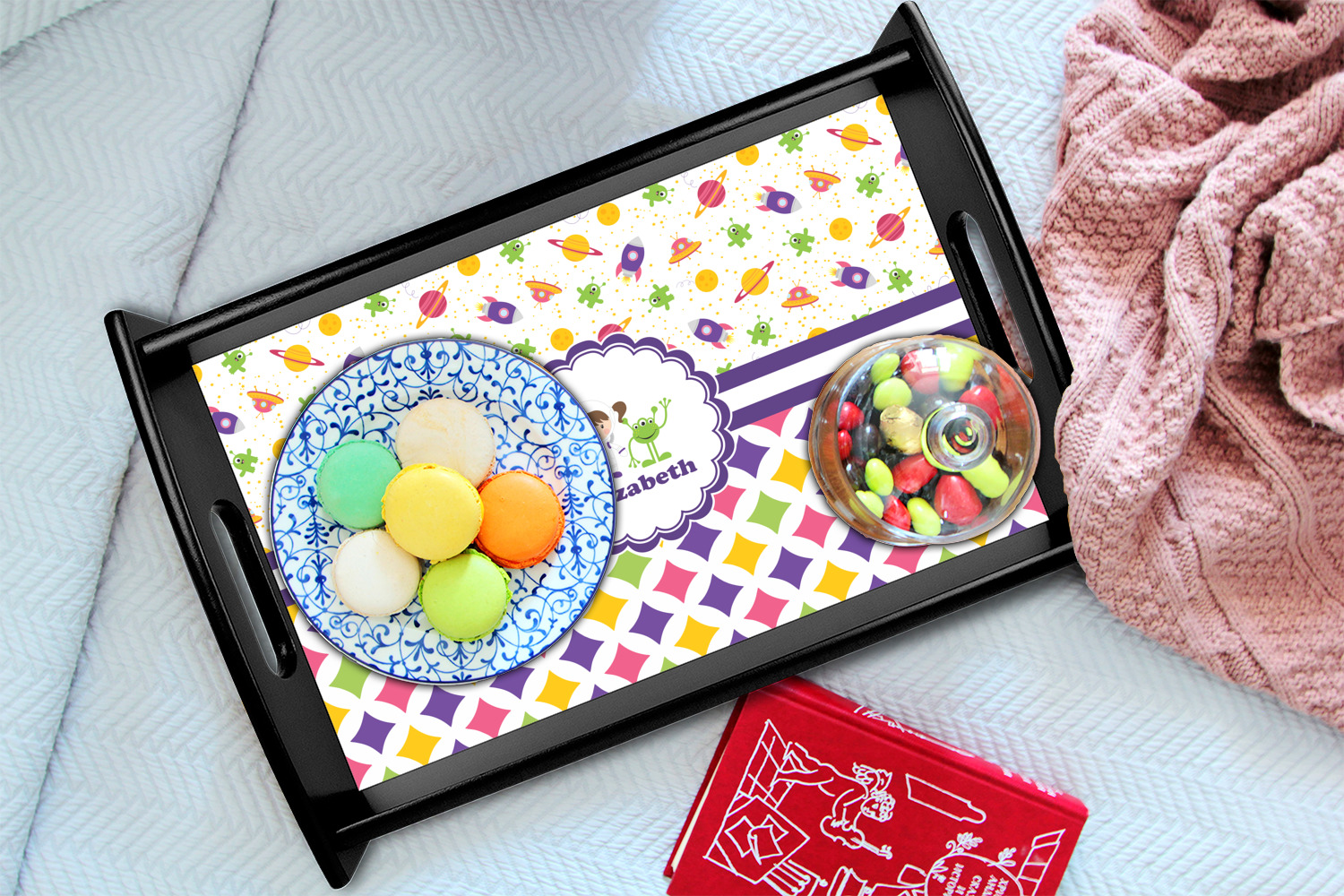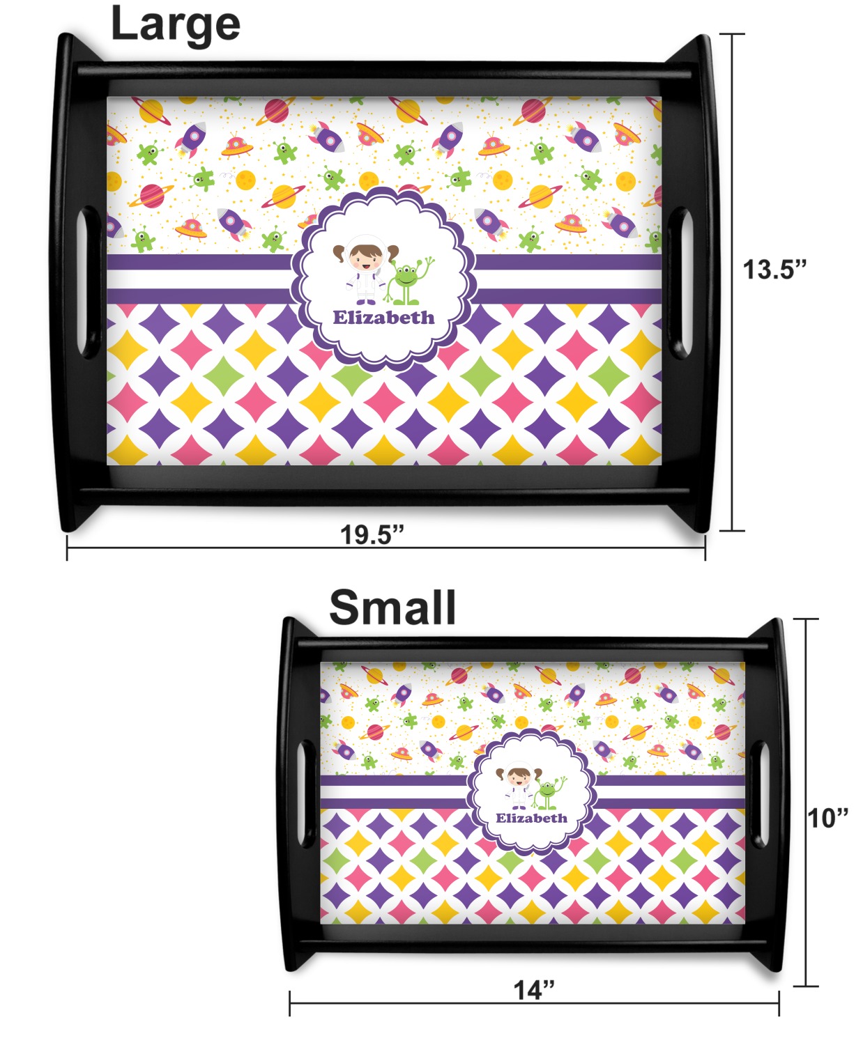 This serving tray with handles features square edges and two rounded sides, creating a very modern look. Each side is fabricated from a beautifully cut, natural wood. The bottom of the interior of the tray displays your customized design in bright, vibrant color. The tray is sold in both a black color and a natural wood look. Each variation of the wood serving tray has two sizes: Small, which is 14" x 10" x 2.25", and Large, which is 19.5" x 13.5" x 2.75".