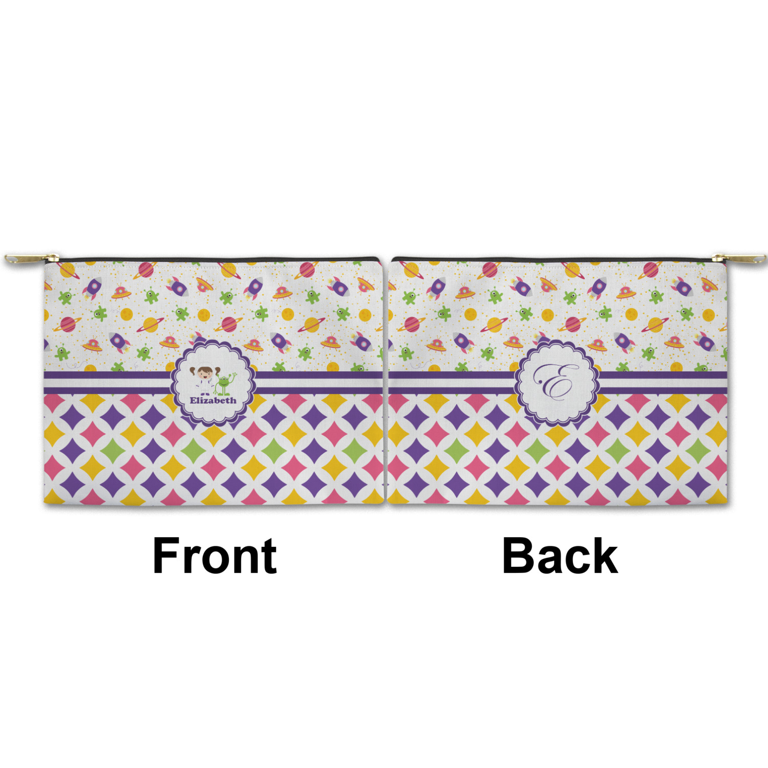 You can design both the front and the back of the pouch - same design, two complementary designs or two totally different designs - the choice is yours! We offer many different personalization styles i.e. name, name & initial, monograms - so the choice to personalize is also yours.